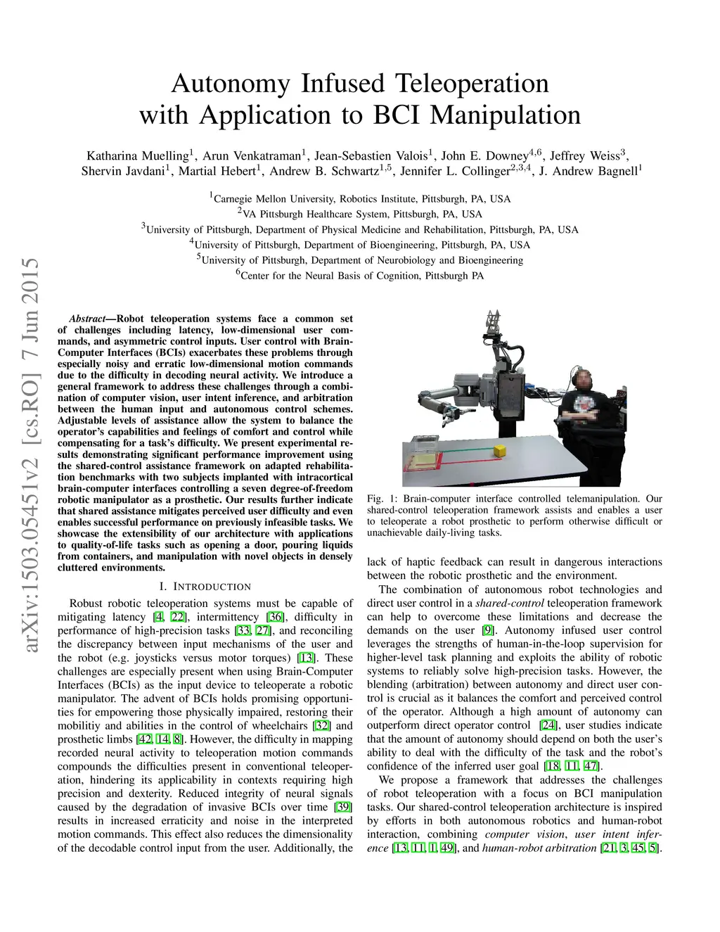 Robot teleoperation systems face a common set of challenges including latency, low-dimensional user commands, and asymmetric control inputs. User control with Brain-Computer Interfaces (BCIs) exacerbates these problems through especially noisy and erratic low-dimensional motion commands due to the difficulty in decoding neural activity. We introduce a general framework to address these challenges through a combination of computer vision, user intent inference, and arbitration between the human input and autonomous control schemes. Adjustable levels of assistance allow the system to balance the operator's capabilities and feelings of comfort and control while compensating for a task's difficulty. We present experimental results demonstrating significant performance improvement using the shared-control assistance framework on adapted rehabilitation benchmarks with two subjects implanted with intracortical brain-computer interfaces controlling a seven degree-of-freedom robotic manipulator as a prosthetic. Our results further indicate that shared assistance mitigates perceived user difficulty and even enables successful performance on previously infeasible tasks. We showcase the extensibility of our architecture with applications to quality-of-life tasks such as opening a door, pouring liquids from containers, and manipulation with novel objects in densely cluttered environments.