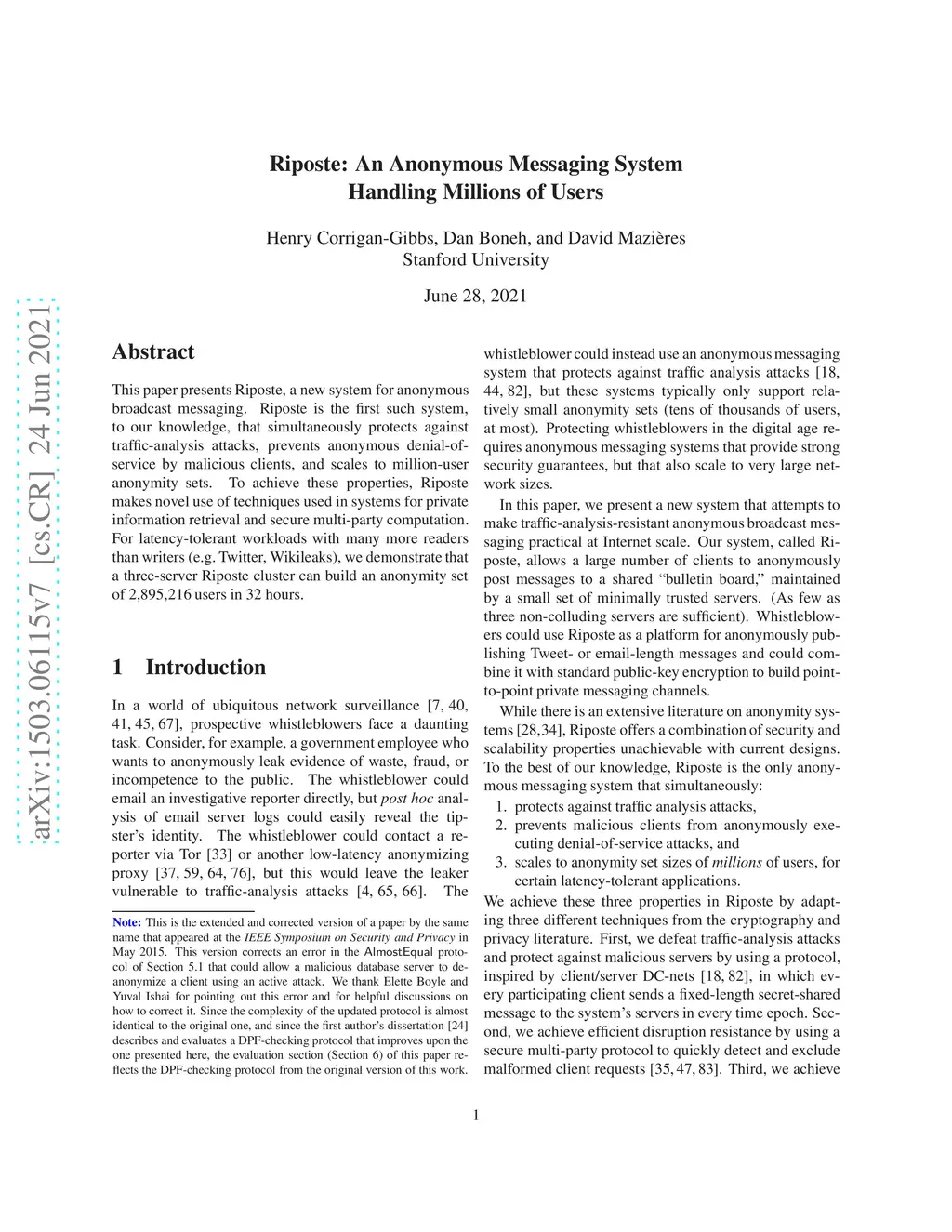 Riposte: An Anonymous Messaging System Handling Millions of Users