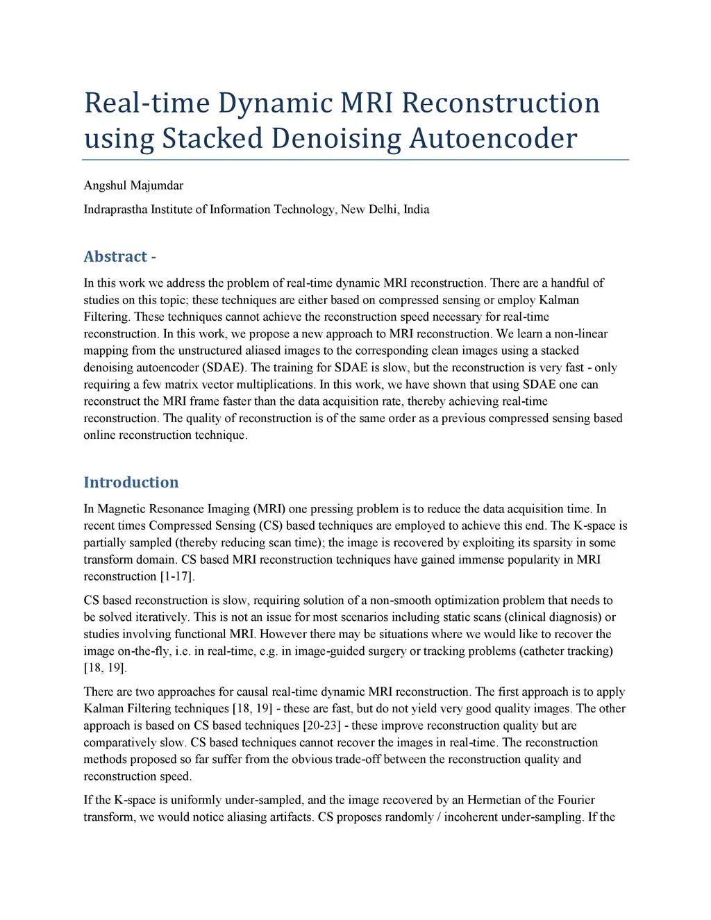 In this work we address the problem of real-time dynamic MRI reconstruction. There are a handful of studies on this topic; these techniques are either based on compressed sensing or employ Kalman Filtering. These techniques cannot achieve the reconstruction speed necessary for real-time reconstruction. In this work, we propose a new approach to MRI reconstruction. We learn a non-linear mapping from the unstructured aliased images to the corresponding clean images using a stacked denoising autoencoder (SDAE). The training for SDAE is slow, but the reconstruction is very fast - only requiring a few matrix vector multiplications. In this work, we have shown that using SDAE one can reconstruct the MRI frame faster than the data acquisition rate, thereby achieving real-time reconstruction. The quality of reconstruction is of the same order as a previous compressed sensing based online reconstruction technique.