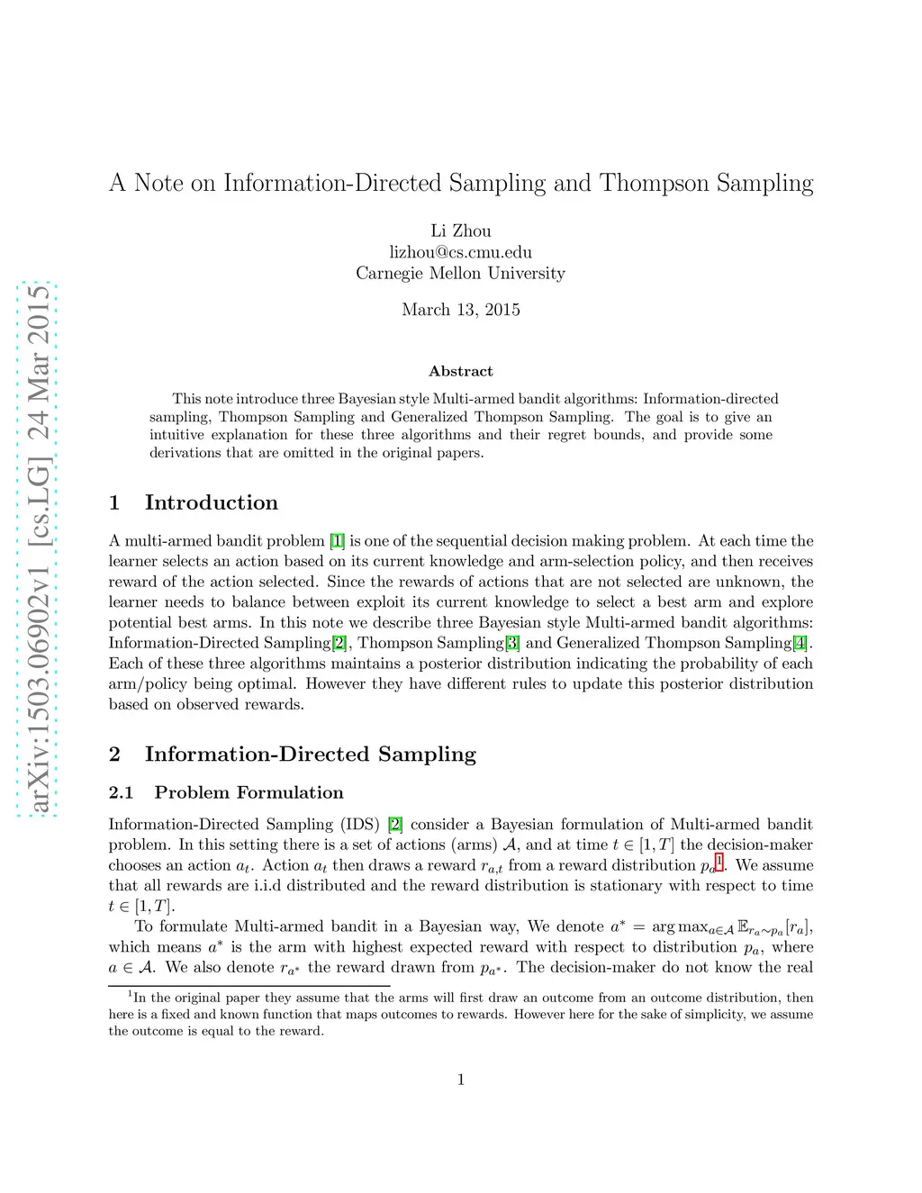 This note introduce three Bayesian style Multi-armed bandit algorithms: Information-directed sampling, Thompson Sampling and Generalized Thompson Sampling. The goal is to give an intuitive explanation for these three algorithms and their regret bounds, and provide some derivations that are omitted in the original papers.