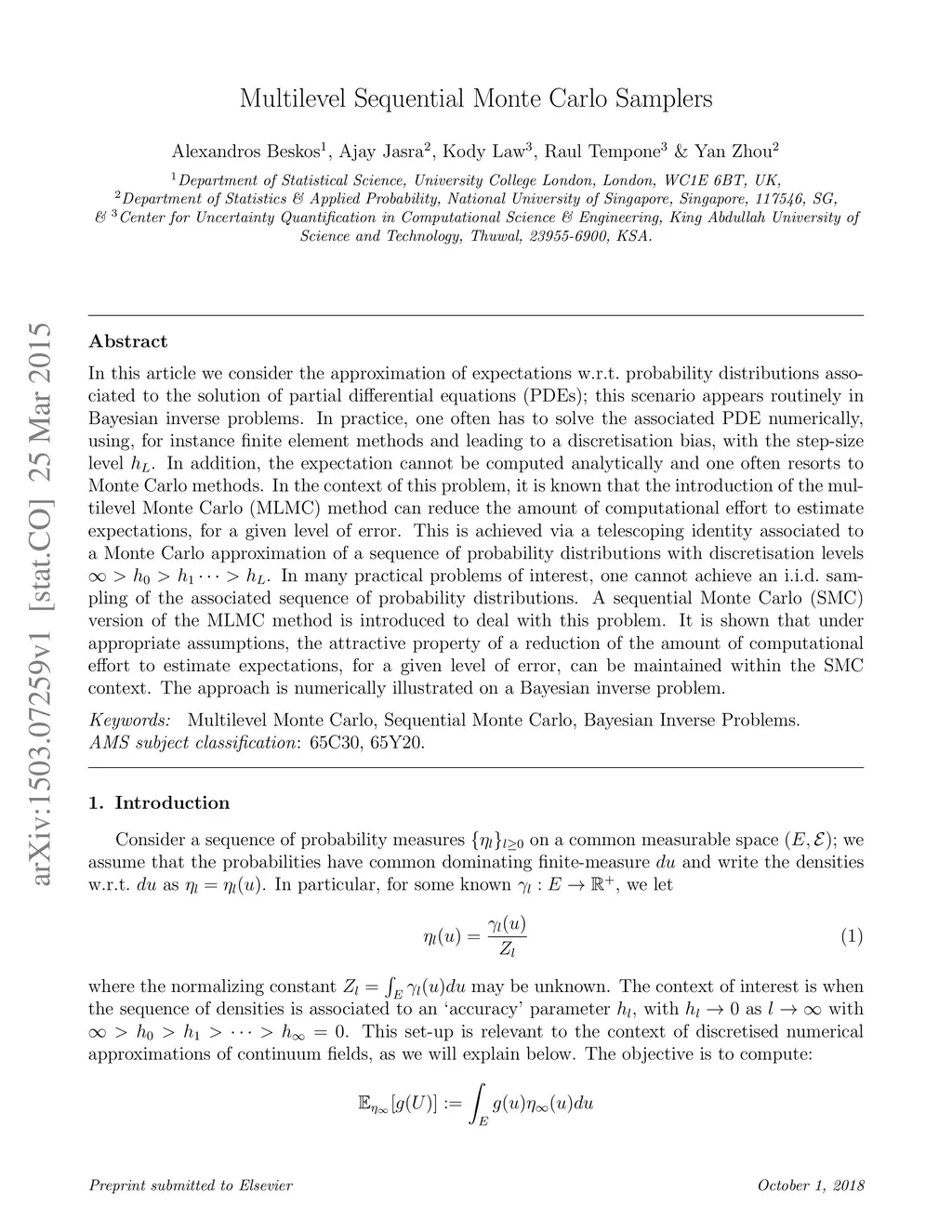 In this article we consider the approximation of expectations w.r.t. probability distributions associated to the solution of partial differential equations (PDEs); this scenario appears routinely in Bayesian inverse problems. In practice, one often has to solve the associated PDE numerically, using, for instance finite element methods and leading to a discretisation bias, with the step-size level . In addition, the expectation cannot be computed analytically and one often resorts to Monte Carlo methods. In the context of this problem, it is known that the introduction of the multilevel Monte Carlo (MLMC) method can reduce the amount of computational effort to estimate expectations, for a given level of error. This is achieved via a telescoping identity associated to a Monte Carlo approximation of a sequence of probability distributions with discretisation levels . In many practical problems of interest, one cannot achieve an i.i.d. sampling of the associated sequence of probability distributions. A sequential Monte Carlo (SMC) version of the MLMC method is introduced to deal with this problem. It is shown that under appropriate assumptions, the attractive property of a reduction of the amount of computational effort to estimate expectations, for a given level of error, can be maintained within the SMC context.