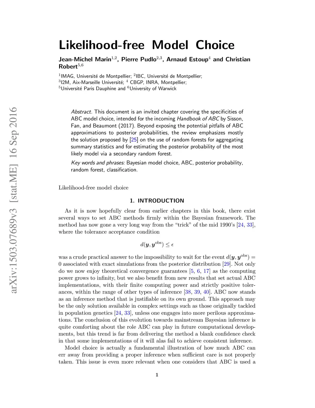 This document is an invited chapter covering the specificities of ABC model choice, intended for the incoming Handbook of ABC by Sisson, Fan, and Beaumont (2017). Beyond exposing the potential pitfalls of ABC based posterior probabilities, the review emphasizes mostly the solution proposed by Pudlo et al. (2016) on the use of random forests for aggregating summary statistics and and for estimating the posterior probability of the most likely model via a secondary random fores.