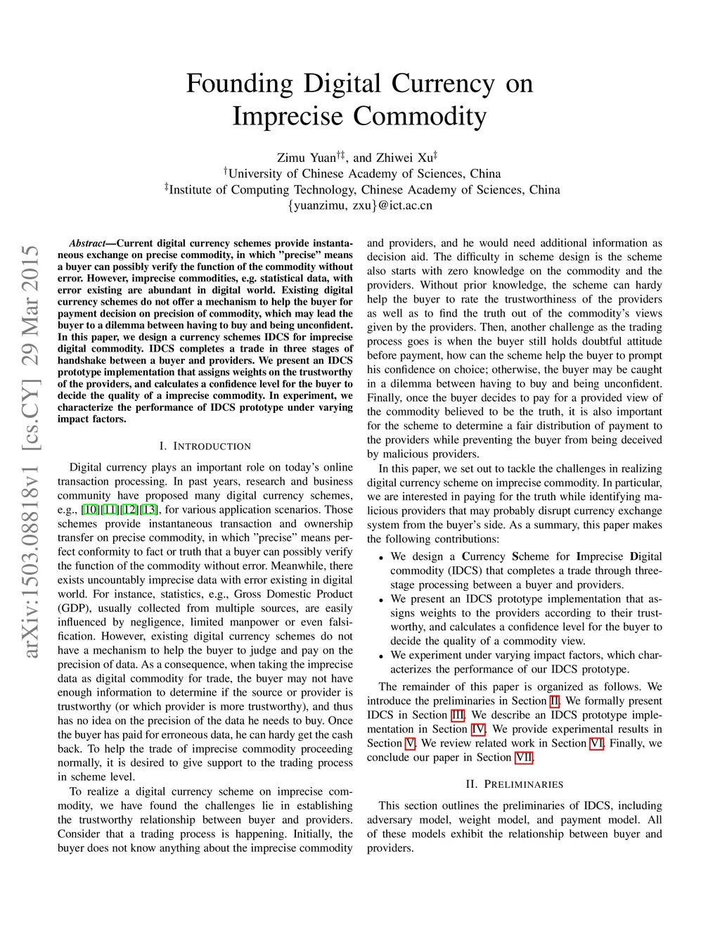 Current digital currency schemes provide instantaneous exchange on precise commodity, in which "precise" means a buyer can possibly verify the function of the commodity without error. However, imprecise commodities, e.g. statistical data, with error existing are abundant in digital world. Existing digital currency schemes do not offer a mechanism to help the buyer for payment decision on precision of commodity, which may lead the buyer to a dilemma between having to buy and being unconfident. In this paper, we design a currency schemes IDCS for imprecise digital commodity. IDCS completes a trade in three stages of handshake between a buyer and providers. We present an IDCS prototype implementation that assigns weights on the trustworthy of the providers, and calculates a confidence level for the buyer to decide the quality of a imprecise commodity. In experiment, we characterize the performance of IDCS prototype under varying impact factors.
