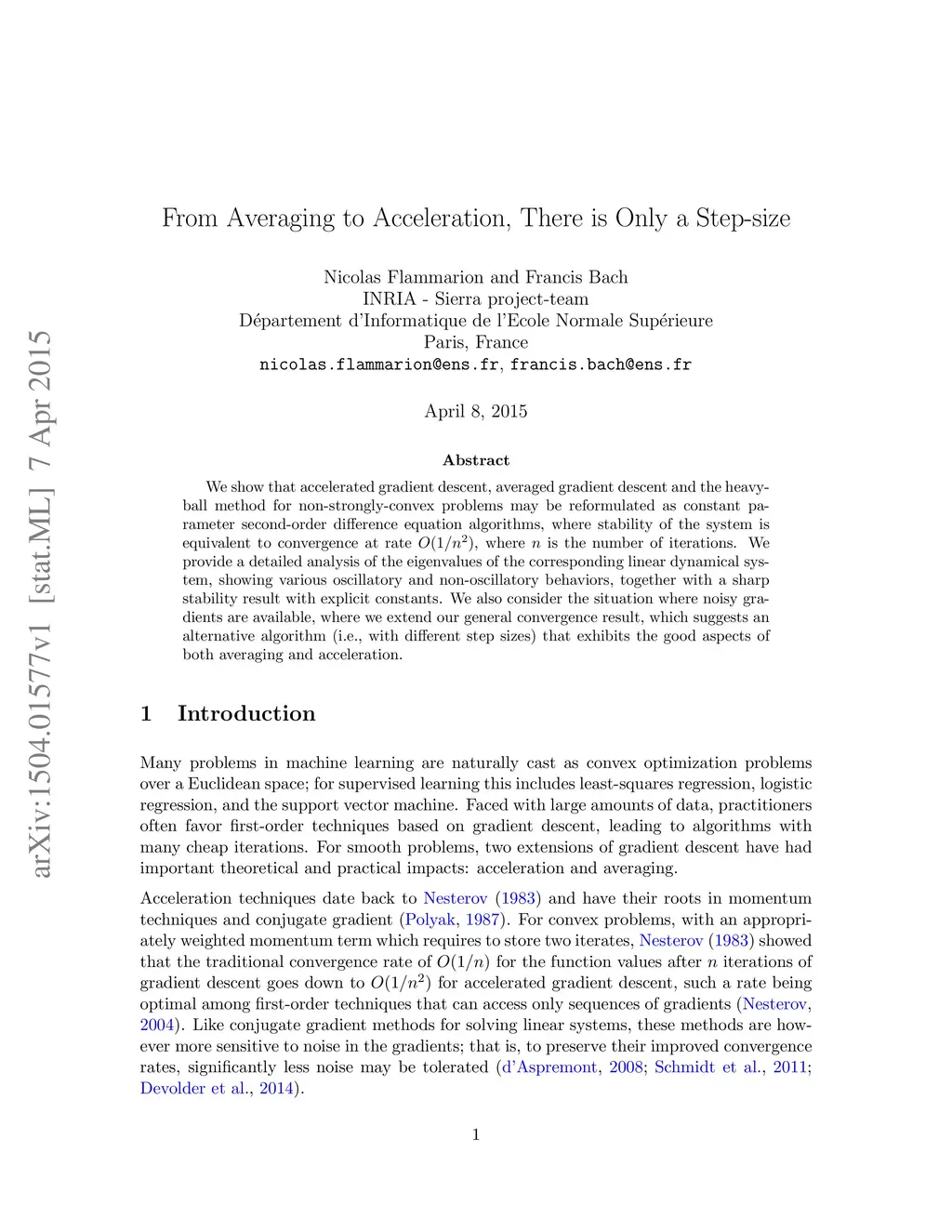 We show that accelerated gradient descent, averaged gradient descent and the heavy-ball method for non-strongly-convex problems may be reformulated as constant parameter second-order difference equation algorithms, where stability of the system is equivalent to convergence at rate O(1/n 2), where n is the number of iterations. We provide a detailed analysis of the eigenvalues of the corresponding linear dynamical system , showing various oscillatory and non-oscillatory behaviors, together with a sharp stability result with explicit constants. We also consider the situation where noisy gradients are available, where we extend our general convergence result, which suggests an alternative algorithm (i.e., with different step sizes) that exhibits the good aspects of both averaging and acceleration.