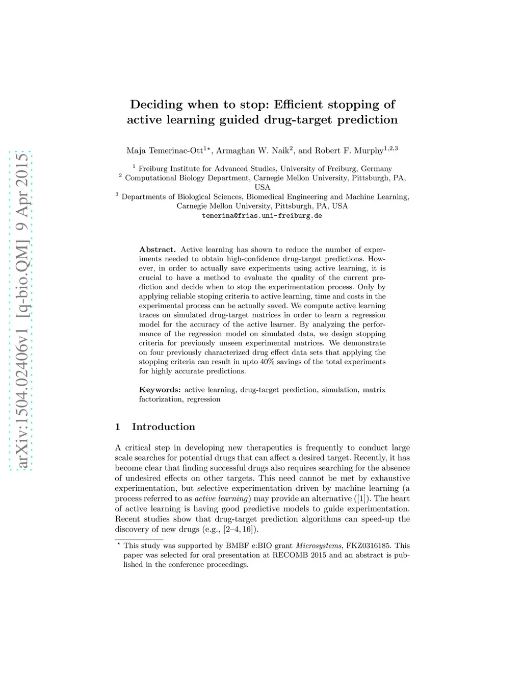 Active learning has shown to reduce the number of experiments needed to obtain high-confidence drug-target predictions. However, in order to actually save experiments using active learning, it is crucial to have a method to evaluate the quality of the current prediction and decide when to stop the experimentation process. Only by applying reliable stoping criteria to active learning, time and costs in the experimental process can be actually saved. We compute active learning traces on simulated drug-target matrices in order to learn a regression model for the accuracy of the active learner. By analyzing the performance of the regression model on simulated data, we design stopping criteria for previously unseen experimental matrices. We demonstrate on four previously characterized drug effect data sets that applying the stopping criteria can result in upto 40% savings of the total experiments for highly accurate predictions.