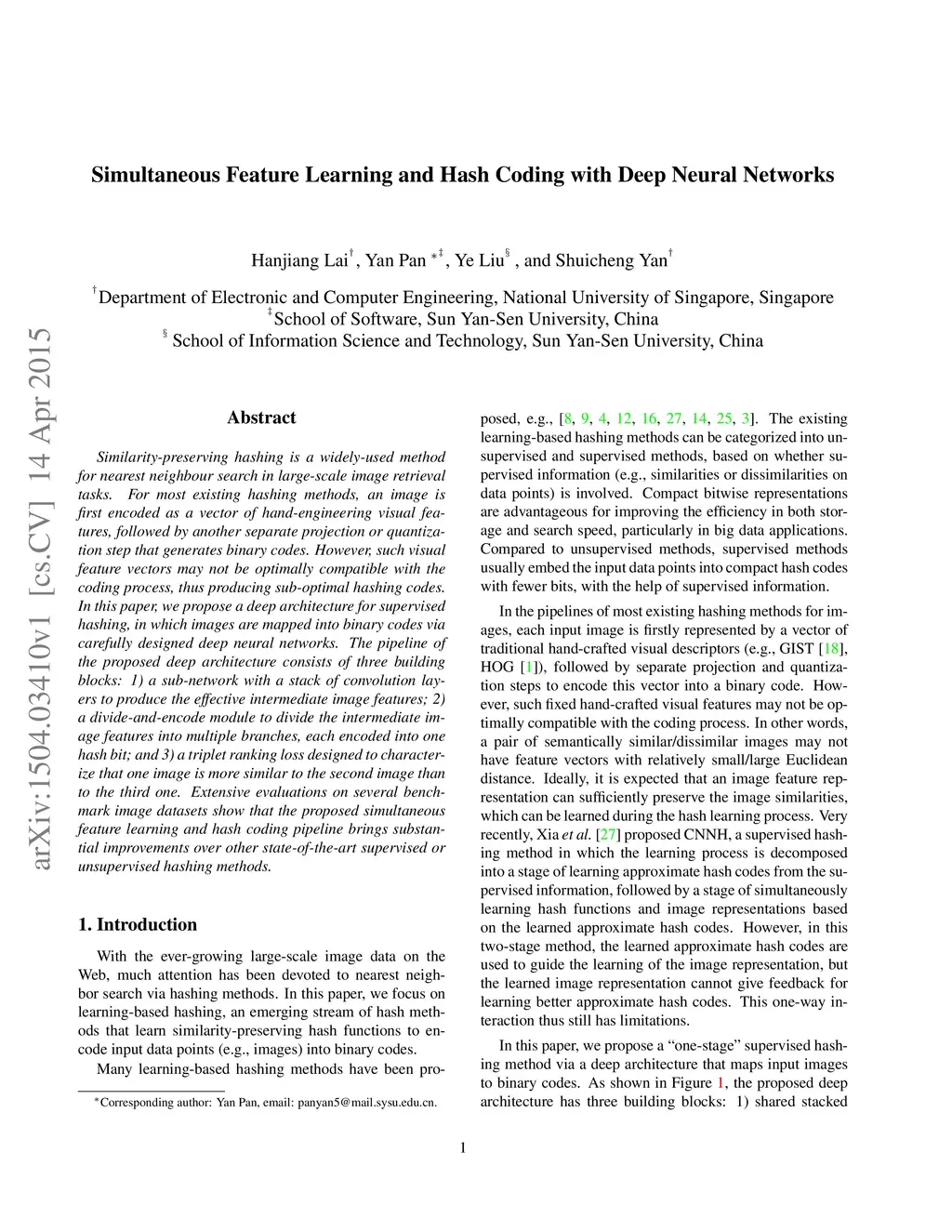 Simultaneous Feature Learning and Hash Coding with Deep Neural Networks