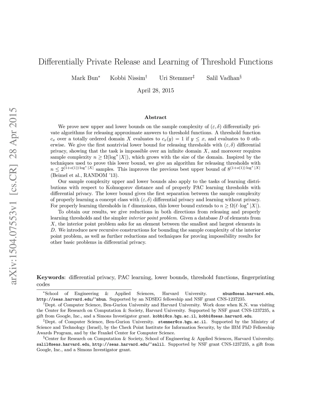 We prove new upper and lower bounds on the sample complexity of differentially private algorithms for releasing approximate answers to threshold functions. A threshold function over a totally ordered domain evaluates to if , and evaluates to otherwise. We give the first nontrivial lower bound for releasing thresholds with differential privacy, showing that the task is impossible over an infinite domain , and moreover requires sample complexity , which grows with the size of the domain. Inspired by the techniques used to prove this lower bound, we give an algorithm for releasing thresholds with samples. This improves the previous best upper bound of (Beimel et al., RANDOM '13). Our sample complexity upper and lower bounds also apply to the tasks of learning distributions with respect to Kolmogorov distance and of properly PAC learning thresholds with differential privacy. The lower bound gives the first separation between the sample complexity of properly learning a concept class with differential privacy and learning without privacy. For properly learning thresholds in dimensions, this lower bound extends to . To obtain our results, we give reductions in both directions from releasing and properly learning thresholds and the simpler interior point problem. Given a database of elements from , the interior point problem asks for an element between the smallest and largest elements in . We introduce new recursive constructions for bounding the sample complexity of the interior point problem, as well as further reductions and techniques for proving impossibility results for other basic problems in differential privacy.