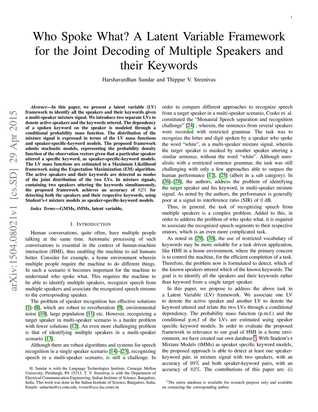 In this paper, we present a latent variable (LV) framework to identify all the speakers and their keywords given a multi-speaker mixture signal. We introduce two separate LVs to denote active speakers and the keywords uttered. The dependency of a spoken keyword on the speaker is modeled through a conditional probability mass function. The distribution of the mixture signal is expressed in terms of the LV mass functions and speaker-specific-keyword models. The proposed framework admits stochastic models, representing the probability density function of the observation vectors given that a particular speaker uttered a specific keyword, as speaker-specific-keyword models. The LV mass functions are estimated in a Maximum Likelihood framework using the Expectation Maximization (EM) algorithm. The active speakers and their keywords are detected as modes of the joint distribution of the two LVs. In mixture signals, containing two speakers uttering the keywords simultaneously, the proposed framework achieves an accuracy of 82% for detecting both the speakers and their respective keywords, using Student's-t mixture models as speaker-specific-keyword models.