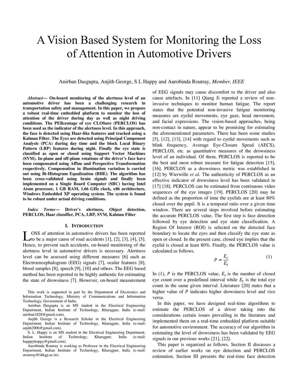 On board monitoring of the alertness level of an automotive driver has been a challenging research in transportation safety and management. In this paper, we propose a robust real time embedded platform to monitor the loss of attention of the driver during day as well as night driving conditions. The PERcentage of eye CLOSure (PERCLOS) has been used as the indicator of the alertness level. In this approach, the face is detected using Haar like features and tracked using a Kalman Filter. The Eyes are detected using Principal Component Analysis (PCA) during day time and the block Local Binary Pattern (LBP) features during night. Finally the eye state is classified as open or closed using Support Vector Machines(SVM). In plane and off plane rotations of the drivers face have been compensated using Affine and Perspective Transformation respectively. Compensation in illumination variation is carried out using Bi Histogram Equalization (BHE). The algorithm has been cross validated using brain signals and finally been implemented on a Single Board Computer (SBC) having Intel Atom processor, 1 GB RAM, 1.66 GHz clock, x86 architecture, Windows Embedded XP operating system. The system is found to be robust under actual driving conditions.