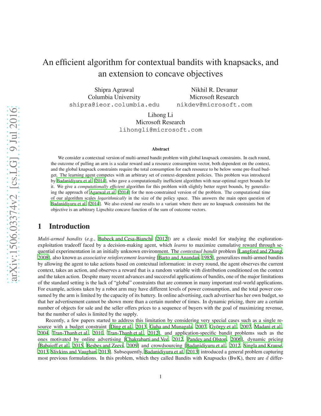 An efficient algorithm for contextual bandits with knapsacks, and an