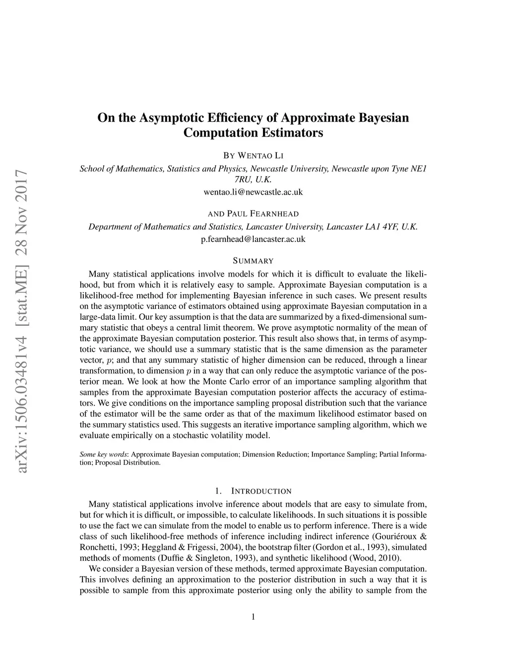 Many statistical applications involve models for which it is difficult to evaluate the likelihood, but from which it is relatively easy to sample. Approximate Bayesian computation is a likelihood-free method for implementing Bayesian inference in such cases. We present results on the asymptotic variance of estimators obtained using approximate Bayesian computation in a large-data limit. Our key assumption is that the data are summarized by a fixed-dimensional summary statistic that obeys a central limit theorem. We prove asymptotic normality of the mean of the approximate Bayesian computation posterior. This result also shows that, in terms of asymptotic variance, we should use a summary statistic that is the same dimension as the parameter vector, p; and that any summary statistic of higher dimension can be reduced, through a linear transformation, to dimension p in a way that can only reduce the asymptotic variance of the posterior mean. We look at how the Monte Carlo error of an importance sampling algorithm that samples from the approximate Bayesian computation posterior affects the accuracy of estimators. We give conditions on the importance sampling proposal distribution such that the variance of the estimator will be the same order as that of the maximum likelihood estimator based on the summary statistics used. This suggests an iterative importance sampling algorithm, which we evaluate empirically on a stochastic volatility model.