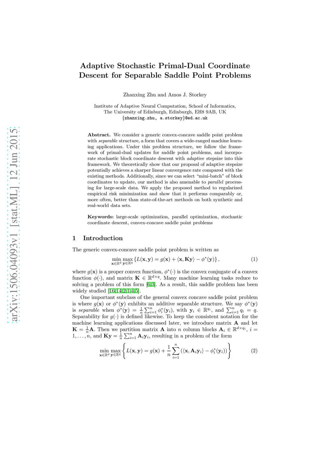 We consider a generic convex-concave saddle point problem with separable structure, a form that covers a wide-ranged machine learning applications. Under this problem structure, we follow the framework of primal-dual updates for saddle point problems, and incorporate stochastic block coordinate descent with adaptive stepsize into this framework. We theoretically show that our proposal of adaptive stepsize potentially achieves a sharper linear convergence rate compared with the existing methods. Additionally, since we can select "mini-batch" of block coordinates to update, our method is also amenable to parallel processing for large-scale data. We apply the proposed method to regularized empirical risk minimization and show that it performs comparably or, more often, better than state-of-the-art methods on both synthetic and real-world data sets.