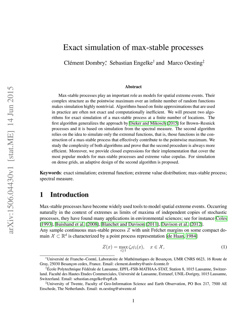 Max-stable processes play an important role as models for spatial extreme events. Their complex structure as the pointwise maximum over an infinite number of random functions makes simulation highly nontrivial. Algorithms based on finite approximations that are used in practice are often not exact and computationally inefficient. We will present two algorithms for exact simulation of a max-stable process at a finite number of locations. The first algorithm generalizes the approach by \citet{DM-2014} for Brown--Resnick processes and it is based on simulation from the spectral measure. The second algorithm relies on the idea to simulate only the extremal functions, that is, those functions in the construction of a max-stable process that effectively contribute to the pointwise maximum. We study the complexity of both algorithms and prove that the second procedure is always more efficient. Moreover, we provide closed expressions for their implementation that cover the most popular models for max-stable processes and extreme value copulas. For simulation on dense grids, an adaptive design of the second algorithm is proposed.