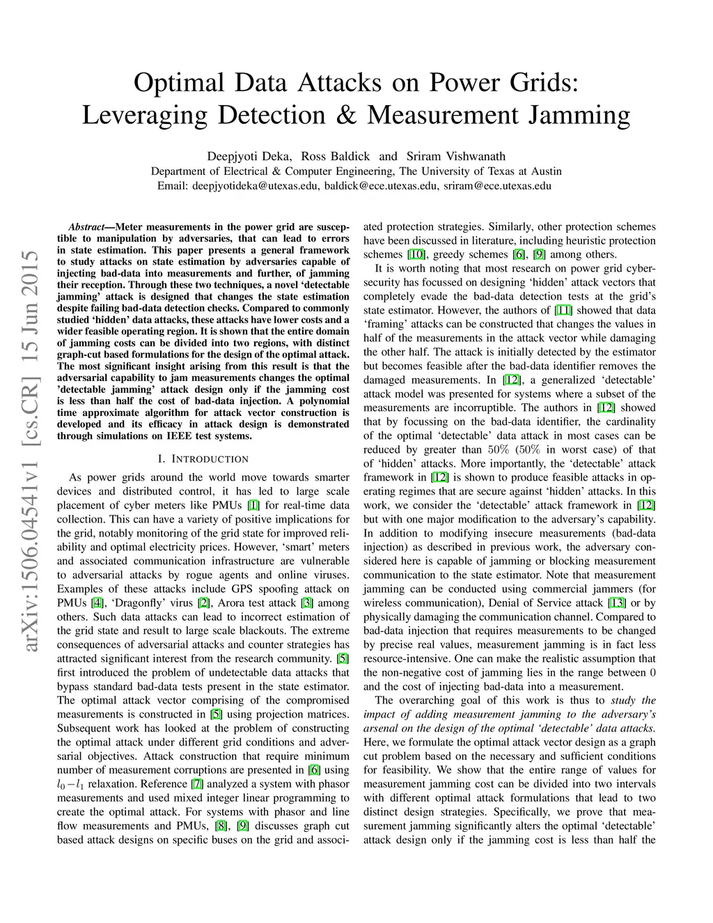 Meter measurements in the power grid are susceptible to manipulation by adversaries, that can lead to errors in state estimation. This paper presents a general framework to study attacks on state estimation by adversaries capable of injecting bad-data into measurements and further, of jamming their reception. Through these two techniques, a novel `detectable jamming' attack is designed that changes the state estimation despite failing bad-data detection checks. Compared to commonly studied `hidden' data attacks, these attacks have lower costs and a wider feasible operating region. It is shown that the entire domain of jamming costs can be divided into two regions, with distinct graph-cut based formulations for the design of the optimal attack. The most significant insight arising from this result is that the adversarial capability to jam measurements changes the optimal 'detectable jamming' attack design only if the jamming cost is less than half the cost of bad-data injection. A polynomial time approximate algorithm for attack vector construction is developed and its efficacy in attack design is demonstrated through simulations on IEEE test systems.