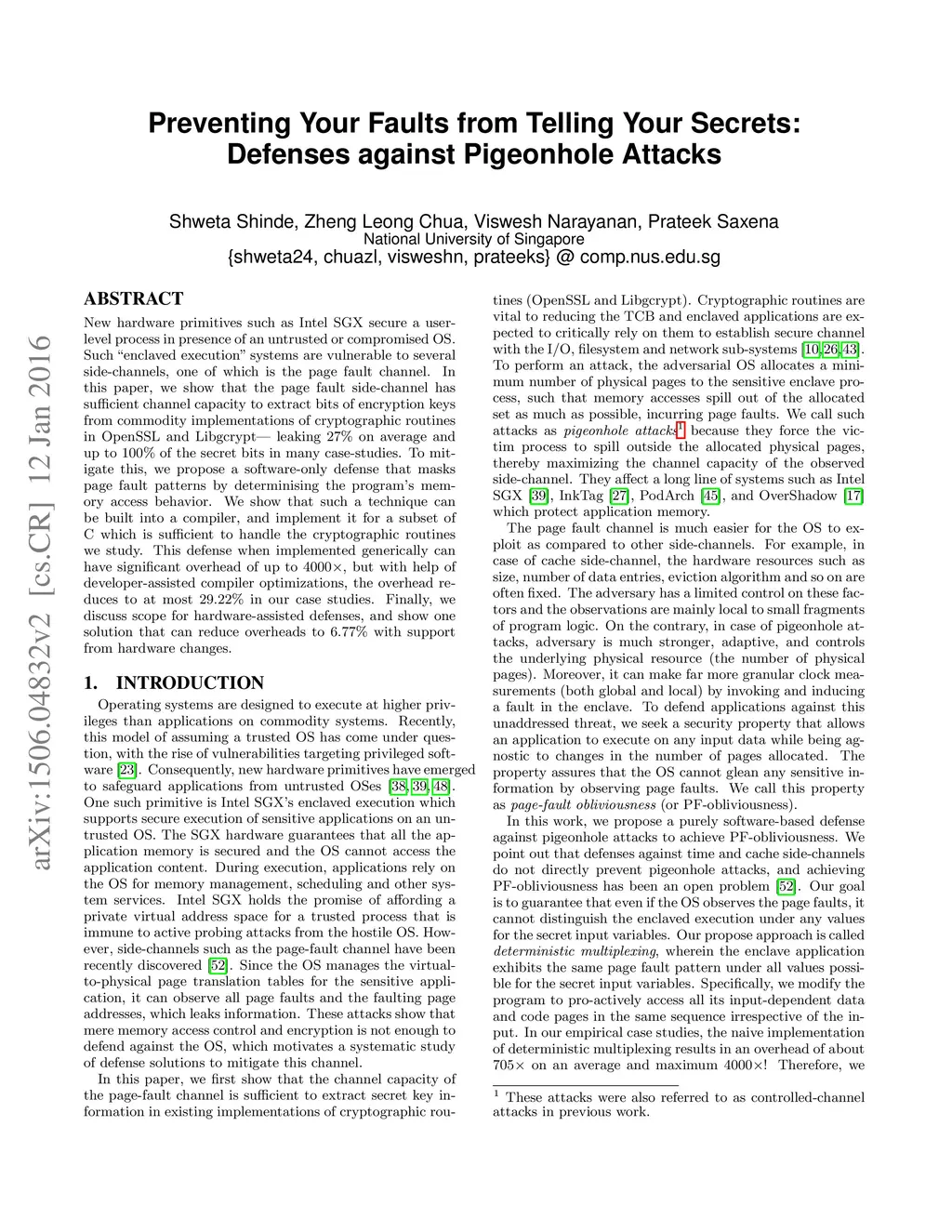 New hardware primitives such as Intel SGX secure a user-level process in presence of an untrusted or compromised OS. Such "enclaved execution" systems are vulnerable to several side-channels, one of which is the page fault channel. In this paper, we show that the page fault side-channel has sufficient channel capacity to extract bits of encryption keys from commodity implementations of cryptographic routines in OpenSSL and Libgcrypt --- leaking 27% on average and up to 100% of the secret bits in many case-studies. To mitigate this, we propose a software-only defense that masks page fault patterns by determinising the program's memory access behavior. We show that such a technique can be built into a compiler, and implement it for a subset of C which is sufficient to handle the cryptographic routines we study. This defense when implemented generically can have significant overhead of up to 4000X, but with help of developer-assisted compiler optimizations, the overhead reduces to at most 29.22% in our case studies. Finally, we discuss scope for hardware-assisted defenses, and show one solution that can reduce overheads to 6.77% with support from hardware changes.
