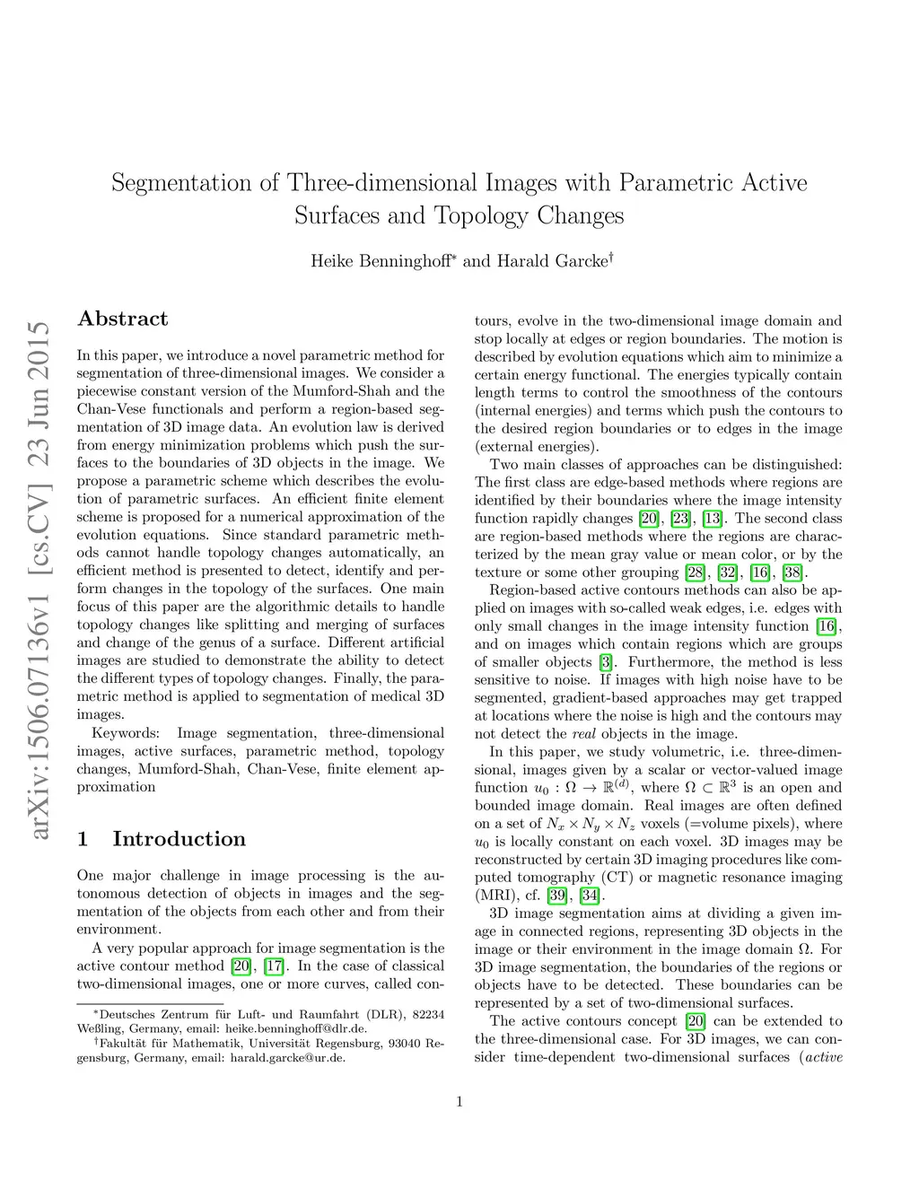 Segmentation of Three-dimensional Images with Parametric Active Surfaces