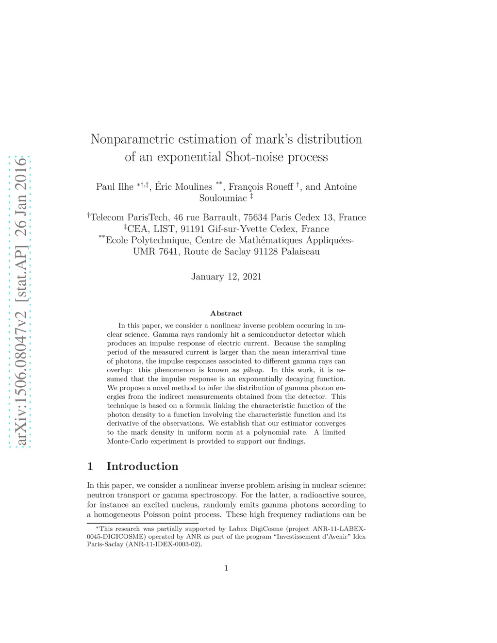 In this paper, we consider a nonlinear inverse problem occurring in nuclear science. Gamma rays randomly hit a semiconductor detector which produces an impulse response of electric current. Because the sampling period of the measured current is larger than the mean inter arrival time of photons, the impulse responses associated to different gamma rays can overlap: this phenomenon is known as pileup. In this work, it is assumed that the impulse response is an exponentially decaying function. We propose a novel method to infer the distribution of gamma photon energies from the indirect measurements obtained from the detector. This technique is based on a formula linking the characteristic function of the photon density to a function involving the characteristic function and its derivative of the observations. We establish that our estimator converges to the mark density in uniform norm at a logarithmic rate. A limited Monte-Carlo experiment is provided to support our findings.