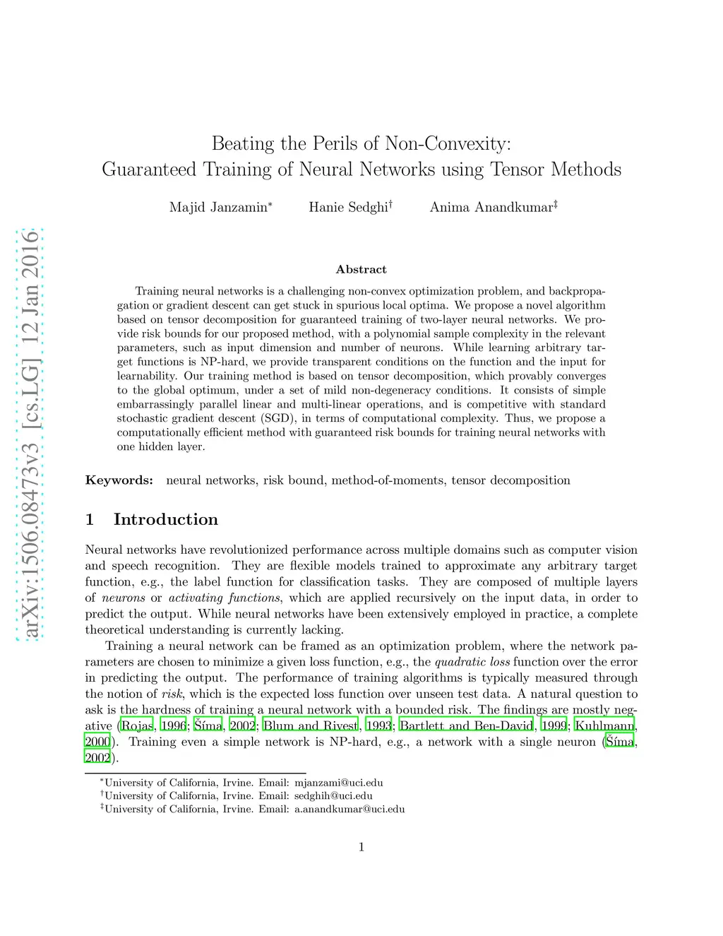 Training neural networks is a challenging non-convex optimization problem, and backpropagation or gradient descent can get stuck in spurious local optima. We propose a novel algorithm based on tensor decomposition for guaranteed training of two-layer neural networks. We provide risk bounds for our proposed method, with a polynomial sample complexity in the relevant parameters, such as input dimension and number of neurons. While learning arbitrary target functions is NP-hard, we provide transparent conditions on the function and the input for learnability. Our training method is based on tensor decomposition, which provably converges to the global optimum, under a set of mild non-degeneracy conditions. It consists of simple embarrassingly parallel linear and multi-linear operations, and is competitive with standard stochastic gradient descent (SGD), in terms of computational complexity. Thus, we propose a computationally efficient method with guaranteed risk bounds for training neural networks with one hidden layer.