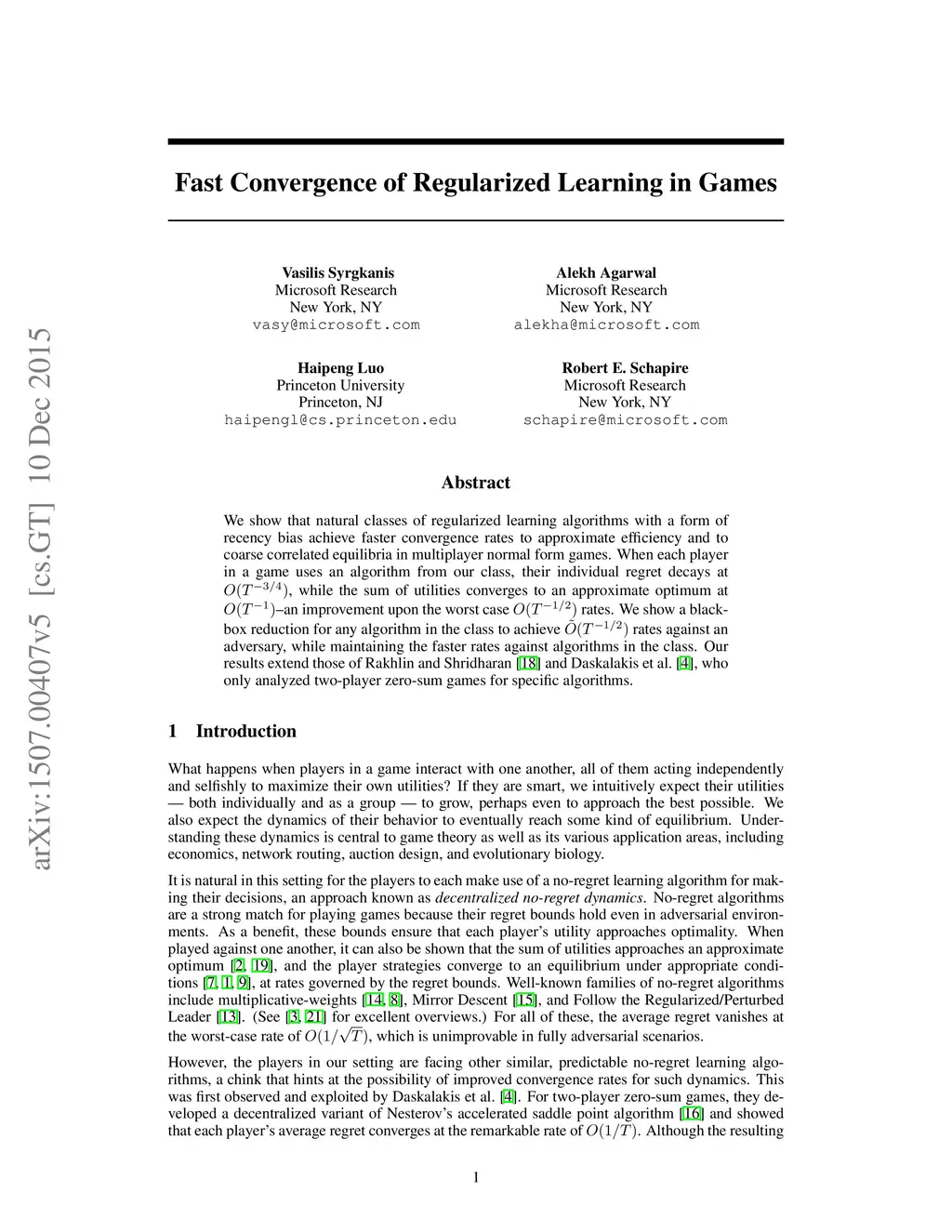 We show that natural classes of regularized learning algorithms with a form of recency bias achieve faster convergence rates to approximate efficiency and to coarse correlated equilibria in multiplayer normal form games. When each player in a game uses an algorithm from our class, their individual regret decays at , while the sum of utilities converges to an approximate optimum at --an improvement upon the worst case rates. We show a black-box reduction for any algorithm in the class to achieve rates against an adversary, while maintaining the faster rates against algorithms in the class. Our results extend those of [Rakhlin and Shridharan 2013] and [Daskalakis et al. 2014], who only analyzed two-player zero-sum games for specific algorithms.