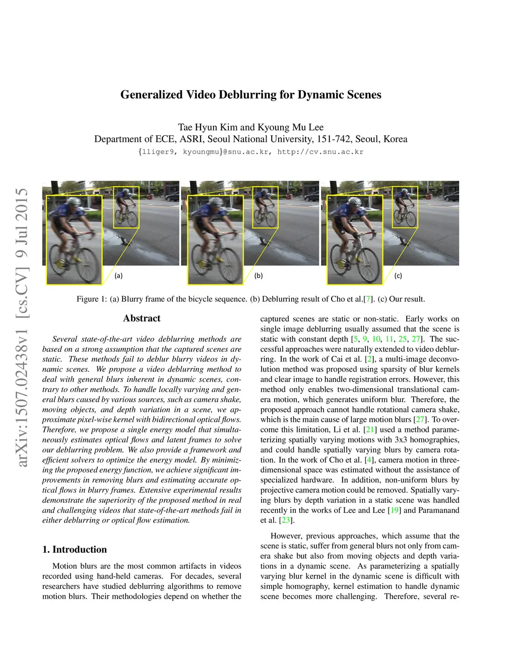 Several state-of-the-art video deblurring methods are based on a strong assumption that the captured scenes are static. These methods fail to deblur blurry videos in dynamic scenes. We propose a video deblurring method to deal with general blurs inherent in dynamic scenes, contrary to other methods. To handle locally varying and general blurs caused by various sources, such as camera shake, moving objects, and depth variation in a scene, we approximate pixel-wise kernel with bidirectional optical flows. Therefore, we propose a single energy model that simultaneously estimates optical flows and latent frames to solve our deblurring problem. We also provide a framework and efficient solvers to optimize the energy model. By minimizing the proposed energy function, we achieve significant improvements in removing blurs and estimating accurate optical flows in blurry frames. Extensive experimental results demonstrate the superiority of the proposed method in real and challenging videos that state-of-the-art methods fail in either deblurring or optical flow estimation.