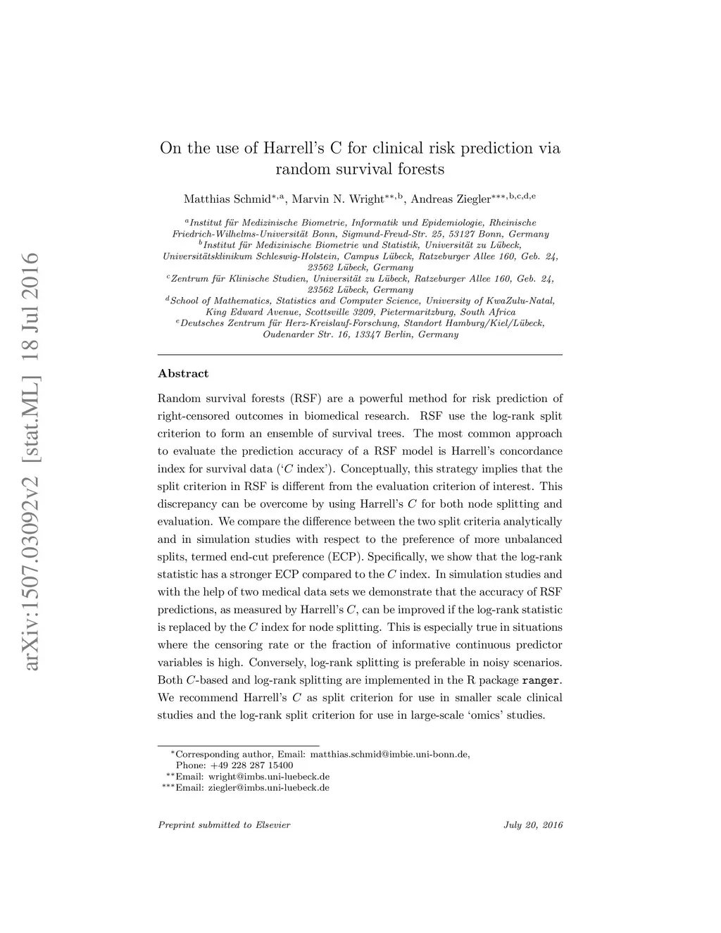 Random survival forests (RSF) are a powerful method for risk prediction of right-censored outcomes in biomedical research. RSF use the log-rank split criterion to form an ensemble of survival trees. The most common approach to evaluate the prediction accuracy of a RSF model is Harrell's concordance index for survival data ('C index'). Conceptually, this strategy implies that the split criterion in RSF is different from the evaluation criterion of interest. This discrepancy can be overcome by using Harrell's C for both node splitting and evaluation. We compare the difference between the two split criteria analytically and in simulation studies with respect to the preference of more unbalanced splits, termed end-cut preference (ECP). Specifically, we show that the log-rank statistic has a stronger ECP compared to the C index. In simulation studies and with the help of two medical data sets we demonstrate that the accuracy of RSF predictions, as measured by Harrell's C, can be improved if the log-rank statistic is replaced by the C index for node splitting. This is especially true in situations where the censoring rate or the fraction of informative continuous predictor variables is high. Conversely, log-rank splitting is preferable in noisy scenarios. Both C-based and log-rank splitting are implemented in the R~package ranger. We recommend Harrell's C as split criterion for use in smaller scale clinical studies and the log-rank split criterion for use in large-scale ómics' studies.