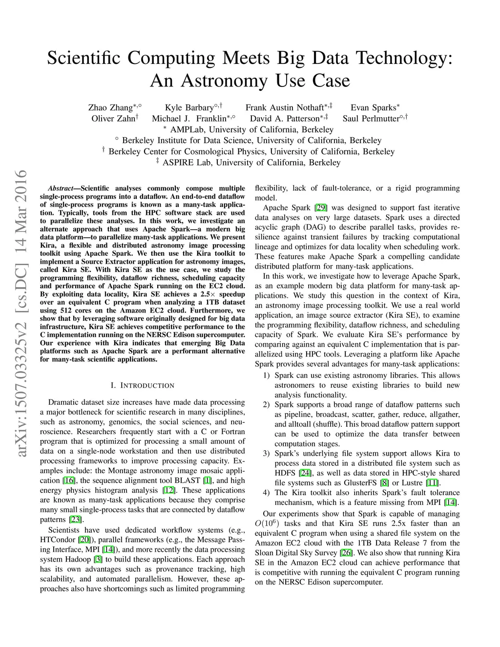 Scientific analyses commonly compose multiple single-process programs into a dataflow. An end-to-end dataflow of single-process programs is known as a many-task application. Typically, tools from the HPC software stack are used to parallelize these analyses. In this work, we investigate an alternate approach that uses Apache Spark -- a modern big data platform -- to parallelize many-task applications. We present Kira, a flexible and distributed astronomy image processing toolkit using Apache Spark. We then use the Kira toolkit to implement a Source Extractor application for astronomy images, called Kira SE. With Kira SE as the use case, we study the programming flexibility, dataflow richness, scheduling capacity and performance of Apache Spark running on the EC2 cloud. By exploiting data locality, Kira SE achieves a 2.5x speedup over an equivalent C program when analyzing a 1TB dataset using 512 cores on the Amazon EC2 cloud. Furthermore, we show that by leveraging software originally designed for big data infrastructure, Kira SE achieves competitive performance to the C implementation running on the NERSC Edison supercomputer. Our experience with Kira indicates that emerging Big Data platforms such as Apache Spark are a performant alternative for many-task scientific applications.