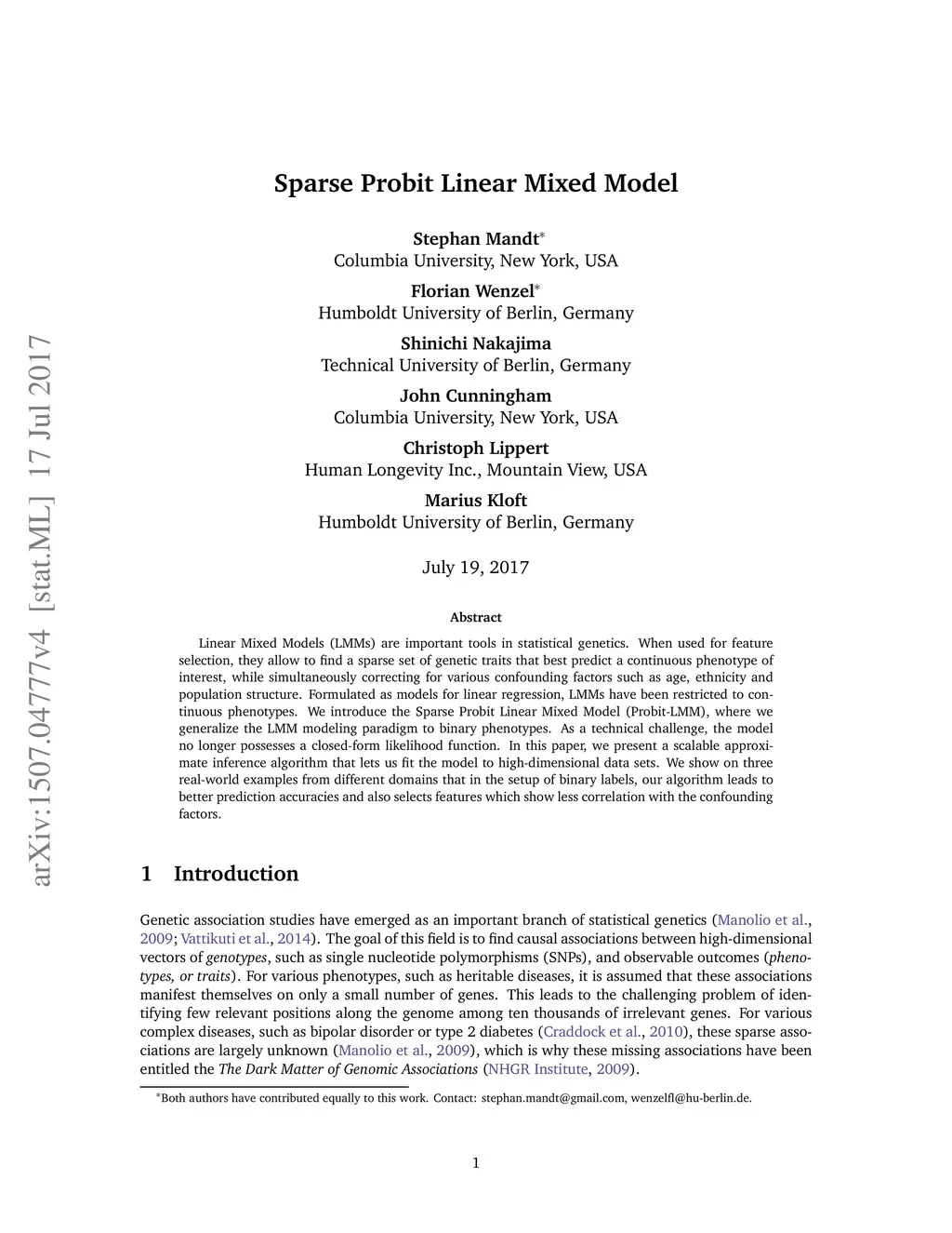 Linear Mixed Models (LMMs) are important tools in statistical genetics. When used for feature selection, they allow to find a sparse set of genetic traits that best predict a continuous phenotype of interest, while simultaneously correcting for various confounding factors such as age, ethnicity and population structure. Formulated as models for linear regression, LMMs have been restricted to continuous phenotypes. We introduce the Sparse Probit Linear Mixed Model (Probit-LMM), where we generalize the LMM modeling paradigm to binary phenotypes. As a technical challenge, the model no longer possesses a closed-form likelihood function. In this paper, we present a scalable approximate inference algorithm that lets us fit the model to high-dimensional data sets. We show on three real-world examples from different domains that in the setup of binary labels, our algorithm leads to better prediction accuracies and also selects features which show less correlation with the confounding factors.