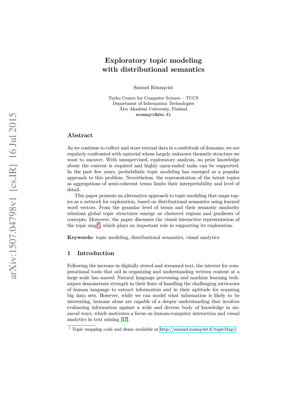 As we continue to collect and store textual data in a multitude of domains, we are regularly confronted with material whose largely unknown thematic structure we want to uncover. With unsupervised, exploratory analysis, no prior knowledge about the content is required and highly open-ended tasks can be supported. In the past few years, probabilistic topic modeling has emerged as a popular approach to this problem. Nevertheless, the representation of the latent topics as aggregations of semi-coherent terms limits their interpretability and level of detail. This paper presents an alternative approach to topic modeling that maps topics as a network for exploration, based on distributional semantics using learned word vectors. From the granular level of terms and their semantic similarity relations global topic structures emerge as clustered regions and gradients of concepts. Moreover, the paper discusses the visual interactive representation of the topic map, which plays an important role in supporting its exploration.