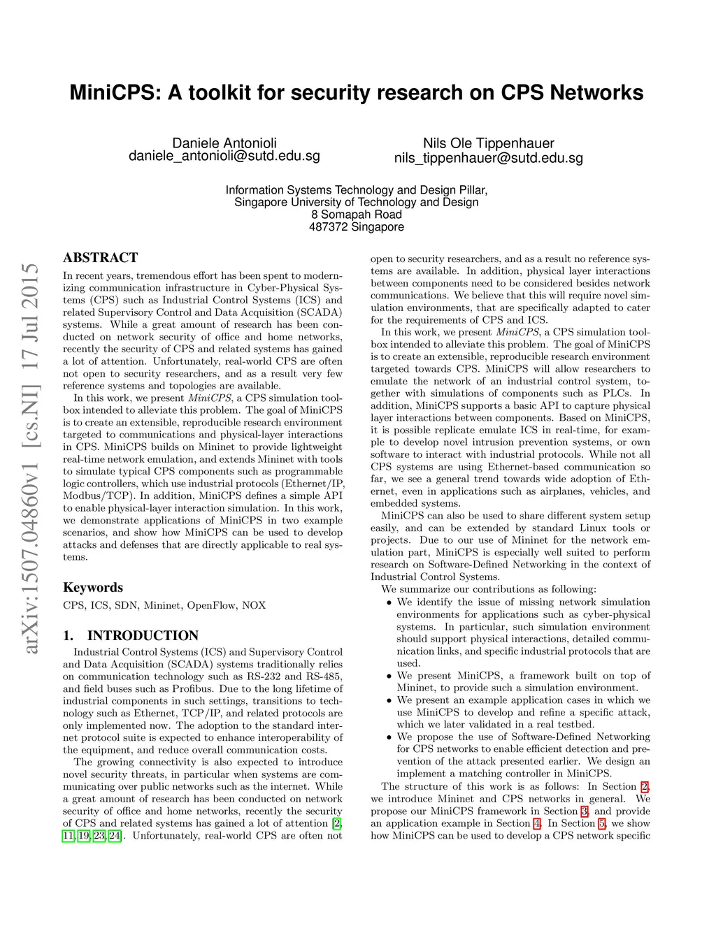 MiniCPS: A toolkit for security research on CPS Networks