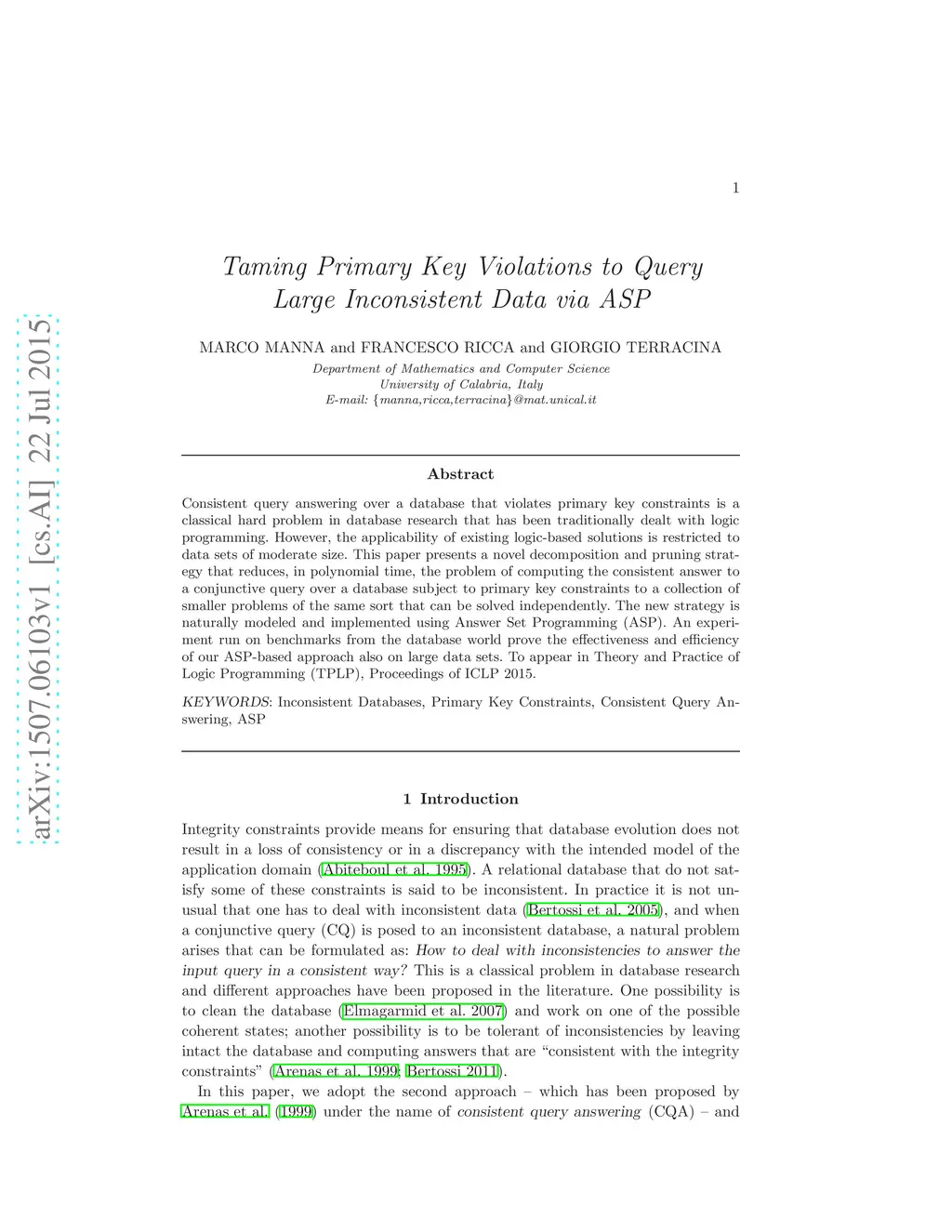 Consistent query answering over a database that violates primary key constraints is a classical hard problem in database research that has been traditionally dealt with logic programming. However, the applicability of existing logic-based solutions is restricted to data sets of moderate size. This paper presents a novel decomposition and pruning strategy that reduces, in polynomial time, the problem of computing the consistent answer to a conjunctive query over a database subject to primary key constraints to a collection of smaller problems of the same sort that can be solved independently. The new strategy is naturally modeled and implemented using Answer Set Programming (ASP). An experiment run on benchmarks from the database world prove the effectiveness and efficiency of our ASP-based approach also on large data sets. To appear in Theory and Practice of Logic Programming (TPLP), Proceedings of ICLP 2015.