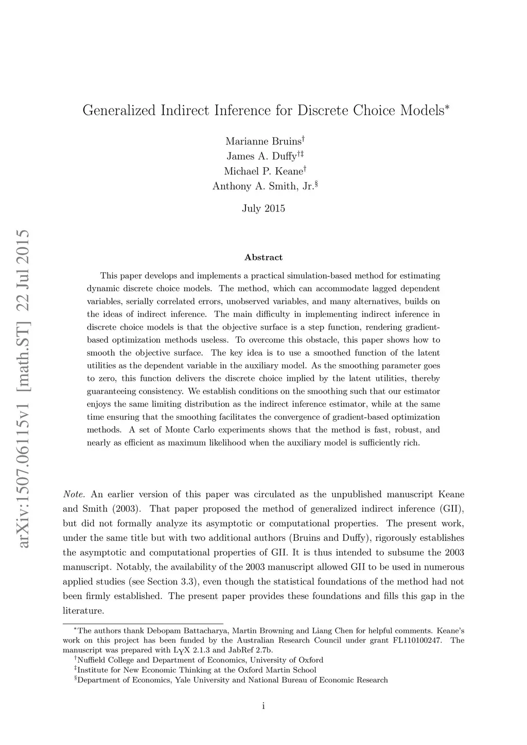 This paper develops and implements a practical simulation-based method for estimating dynamic discrete choice models. The method, which can accommodate lagged dependent variables, serially correlated errors, unobserved variables, and many alternatives, builds on the ideas of indirect inference. The main difficulty in implementing indirect inference in discrete choice models is that the objective surface is a step function, rendering gradient-based optimization methods useless. To overcome this obstacle, this paper shows how to smooth the objective surface. The key idea is to use a smoothed function of the latent utilities as the dependent variable in the auxiliary model. As the smoothing parameter goes to zero, this function delivers the discrete choice implied by the latent utilities, thereby guaranteeing consistency. We establish conditions on the smoothing such that our estimator enjoys the same limiting distribution as the indirect inference estimator, while at the same time ensuring that the smoothing facilitates the convergence of gradient-based optimization methods. A set of Monte Carlo experiments shows that the method is fast, robust, and nearly as efficient as maximum likelihood when the auxiliary model is sufficiently rich.