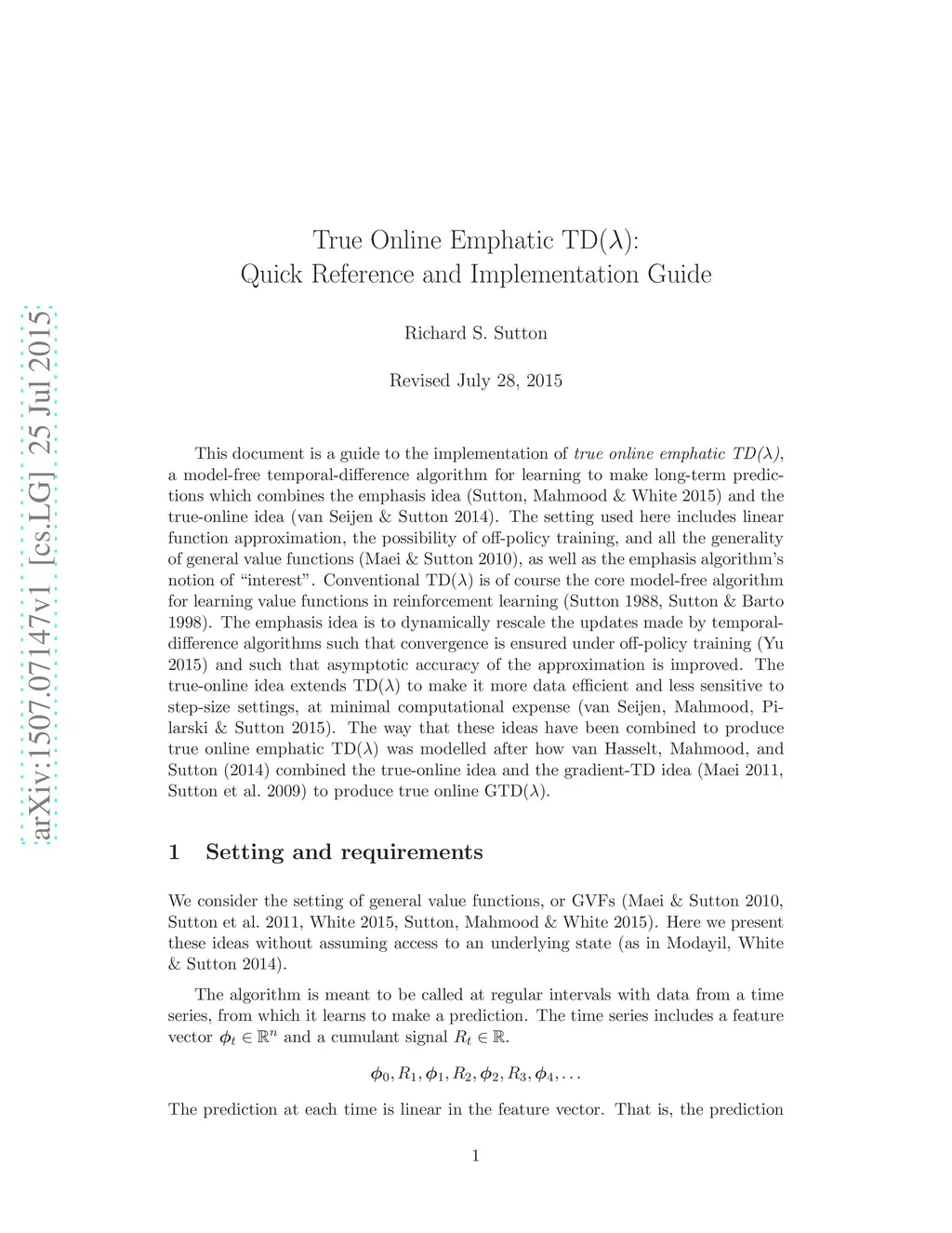 This document is a guide to the implementation of true online emphatic TD(), a model-free temporal-difference algorithm for learning to make long-term predictions which combines the emphasis idea (Sutton, Mahmood & White 2015) and the true-online idea (van Seijen & Sutton 2014). The setting used here includes linear function approximation, the possibility of off-policy training, and all the generality of general value functions, as well as the emphasis algorithm's notion of "interest".