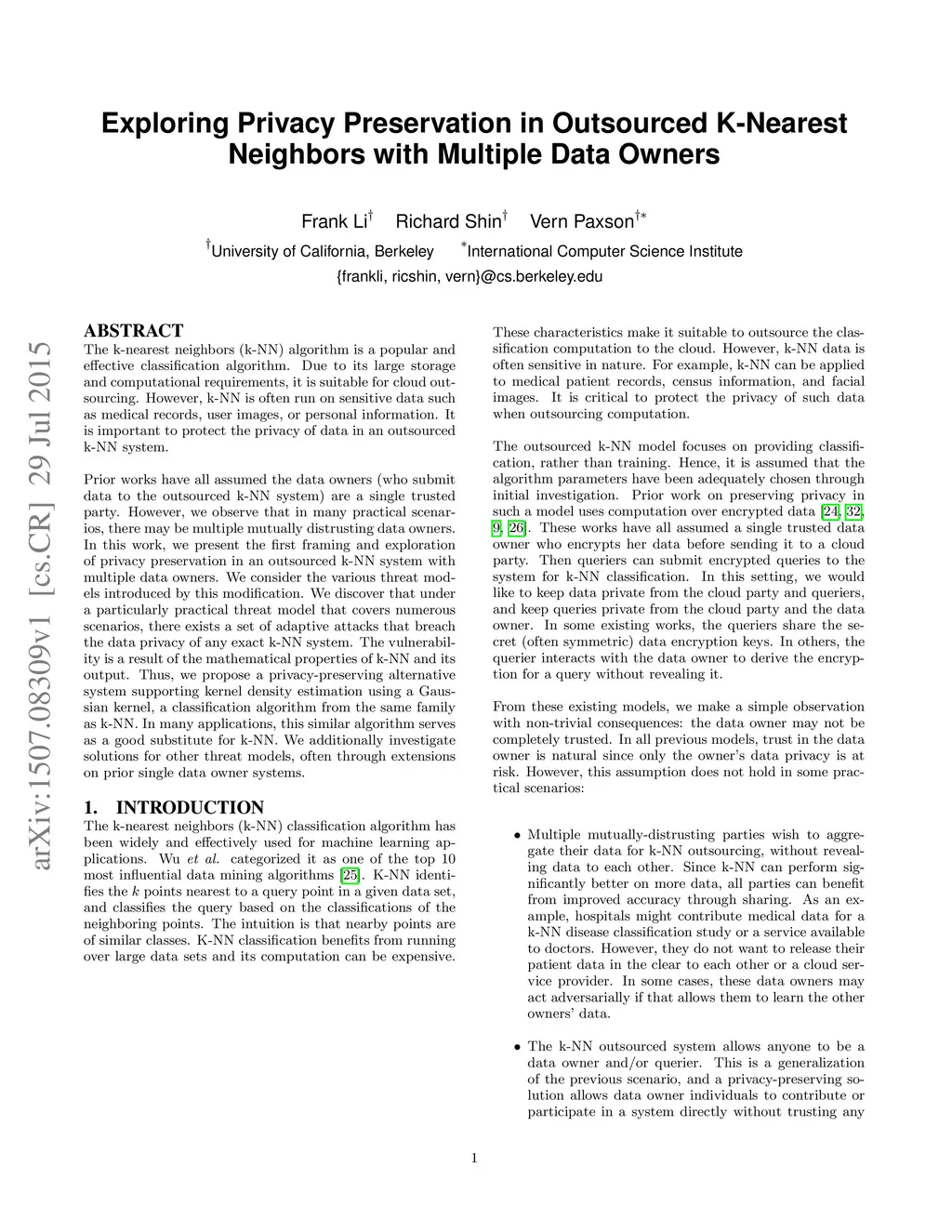 The k-nearest neighbors (k-NN) algorithm is a popular and effective classification algorithm. Due to its large storage and computational requirements, it is suitable for cloud outsourcing. However, k-NN is often run on sensitive data such as medical records, user images, or personal information. It is important to protect the privacy of data in an outsourced k-NN system. Prior works have all assumed the data owners (who submit data to the outsourced k-NN system) are a single trusted party. However, we observe that in many practical scenarios, there may be multiple mutually distrusting data owners. In this work, we present the first framing and exploration of privacy preservation in an outsourced k-NN system with multiple data owners. We consider the various threat models introduced by this modification. We discover that under a particularly practical threat model that covers numerous scenarios, there exists a set of adaptive attacks that breach the data privacy of any exact k-NN system. The vulnerability is a result of the mathematical properties of k-NN and its output. Thus, we propose a privacy-preserving alternative system supporting kernel density estimation using a Gaussian kernel, a classification algorithm from the same family as k-NN. In many applications, this similar algorithm serves as a good substitute for k-NN. We additionally investigate solutions for other threat models, often through extensions on prior single data owner systems.
