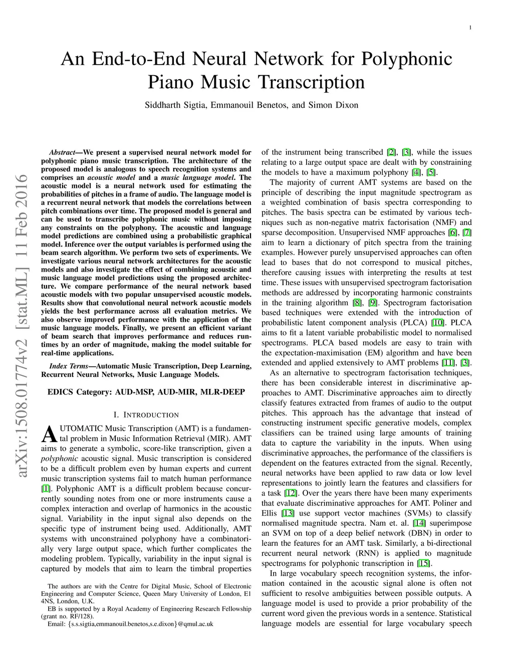 An End-to-End Neural Network for Polyphonic Piano Music Transcription