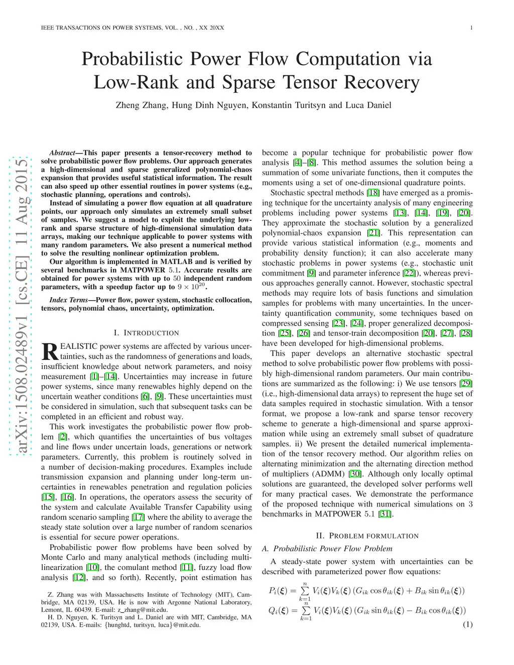 This paper presents a tensor-recovery method to solve probabilistic power flow problems. Our approach generates a high-dimensional and sparse generalized polynomial-chaos expansion that provides useful statistical information. The result can also speed up other essential routines in power systems (e.g., stochastic planning, operations and controls). Instead of simulating a power flow equation at all quadrature points, our approach only simulates an extremely small subset of samples. We suggest a model to exploit the underlying low-rank and sparse structure of high-dimensional simulation data arrays, making our technique applicable to power systems with many random parameters. We also present a numerical method to solve the resulting nonlinear optimization problem. Our algorithm is implemented in MATLAB and is verified by several benchmarks in MATPOWER . Accurate results are obtained for power systems with up to independent random parameters, with a speedup factor up to .