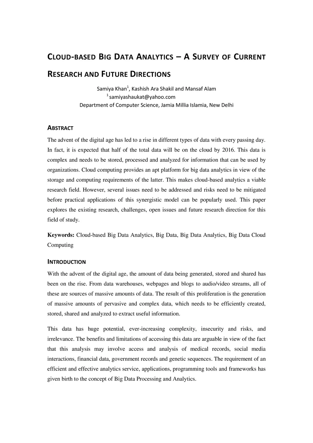 The advent of the digital age has led to a rise in different types of data with every passing day. In fact, it is expected that half of the total data will be on the cloud by 2016. This data is complex and needs to be stored, processed and analyzed for information that can be used by organizations. Cloud computing provides an apt platform for big data analytics in view of the storage and computing requirements of the latter. This makes cloud-based analytics a viable research field. However, several issues need to be addressed and risks need to be mitigated before practical applications of this synergistic model can be popularly used. This paper explores the existing research, challenges, open issues and future research direction for this field of study.
