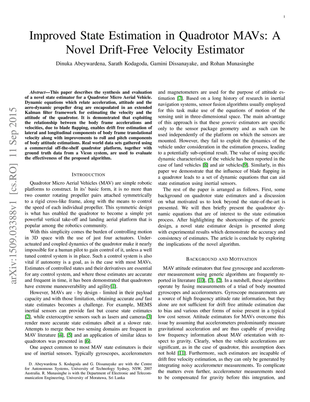 Improved State Estimation in Quadrotor MAVs: A Novel Drift-Free Velocity
