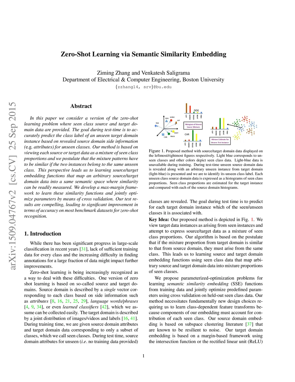 In this paper we consider a version of the zero-shot learning problem where seen class source and target domain data are provided. The goal during test-time is to accurately predict the class label of an unseen target domain instance based on revealed source domain side information (\eg attributes) for unseen classes. Our method is based on viewing each source or target data as a mixture of seen class proportions and we postulate that the mixture patterns have to be similar if the two instances belong to the same unseen class. This perspective leads us to learning source/target embedding functions that map an arbitrary source/target domain data into a same semantic space where similarity can be readily measured. We develop a max-margin framework to learn these similarity functions and jointly optimize parameters by means of cross validation. Our test results are compelling, leading to significant improvement in terms of accuracy on most benchmark datasets for zero-shot recognition.