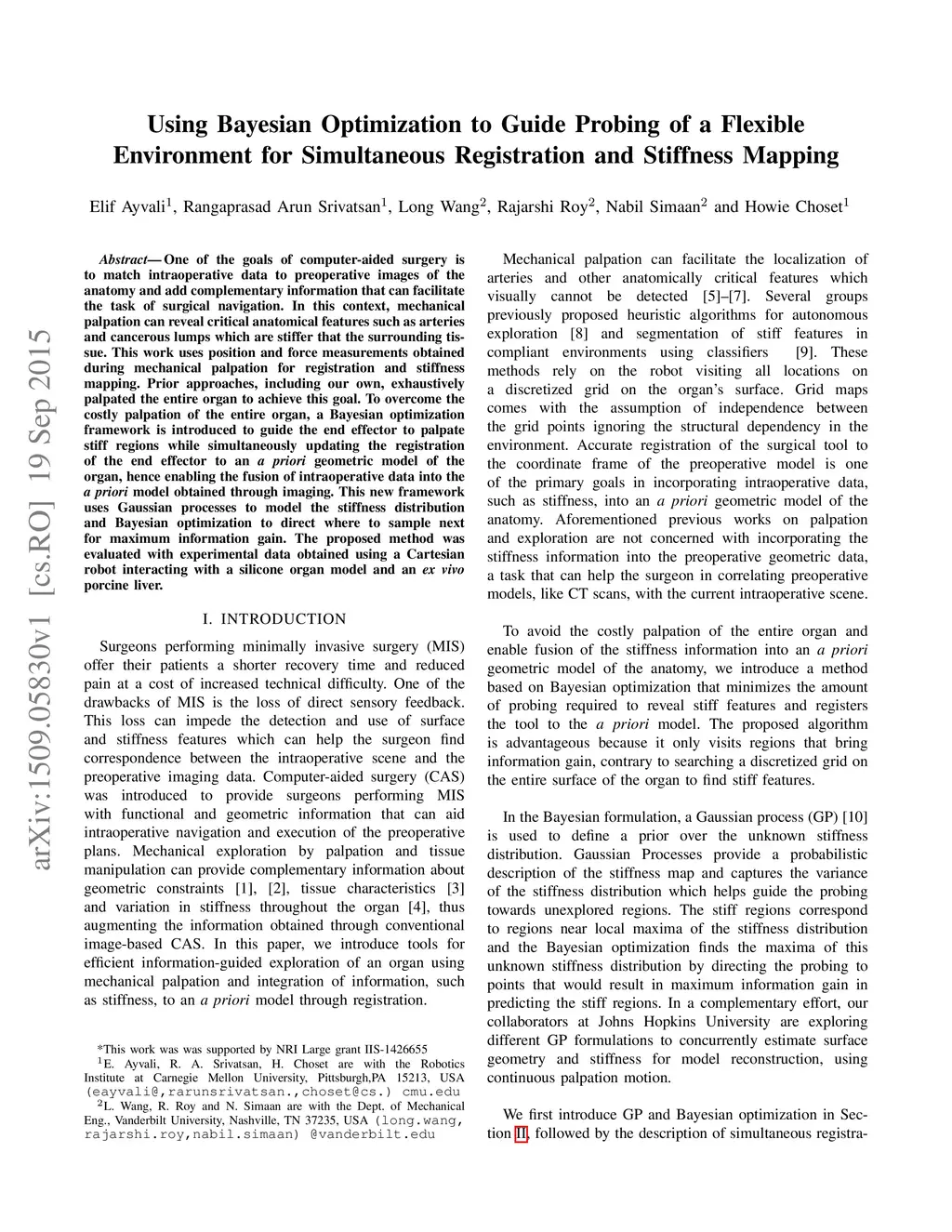 One of the goals of computer-aided surgery is to match intraoperative data to preoperative images of the anatomy and add complementary information that can facilitate the task of surgical navigation. In this context, mechanical palpation can reveal critical anatomical features such as arteries and cancerous lumps which are stiffer that the surrounding tissue. This work uses position and force measurements obtained during mechanical palpation for registration and stiffness mapping. Prior approaches, including our own, exhaustively palpated the entire organ to achieve this goal. To overcome the costly palpation of the entire organ, a Bayesian optimization framework is introduced to guide the end effector to palpate stiff regions while simultaneously updating the registration of the end effector to an a priori geometric model of the organ, hence enabling the fusion of ntraoperative data into the a priori model obtained through imaging. This new framework uses Gaussian processes to model the stiffness distribution and Bayesian optimization to direct where to sample next for maximum information gain. The proposed method was evaluated with experimental data obtained using a Cartesian robot interacting with a silicone organ model and an ex vivo porcine liver.