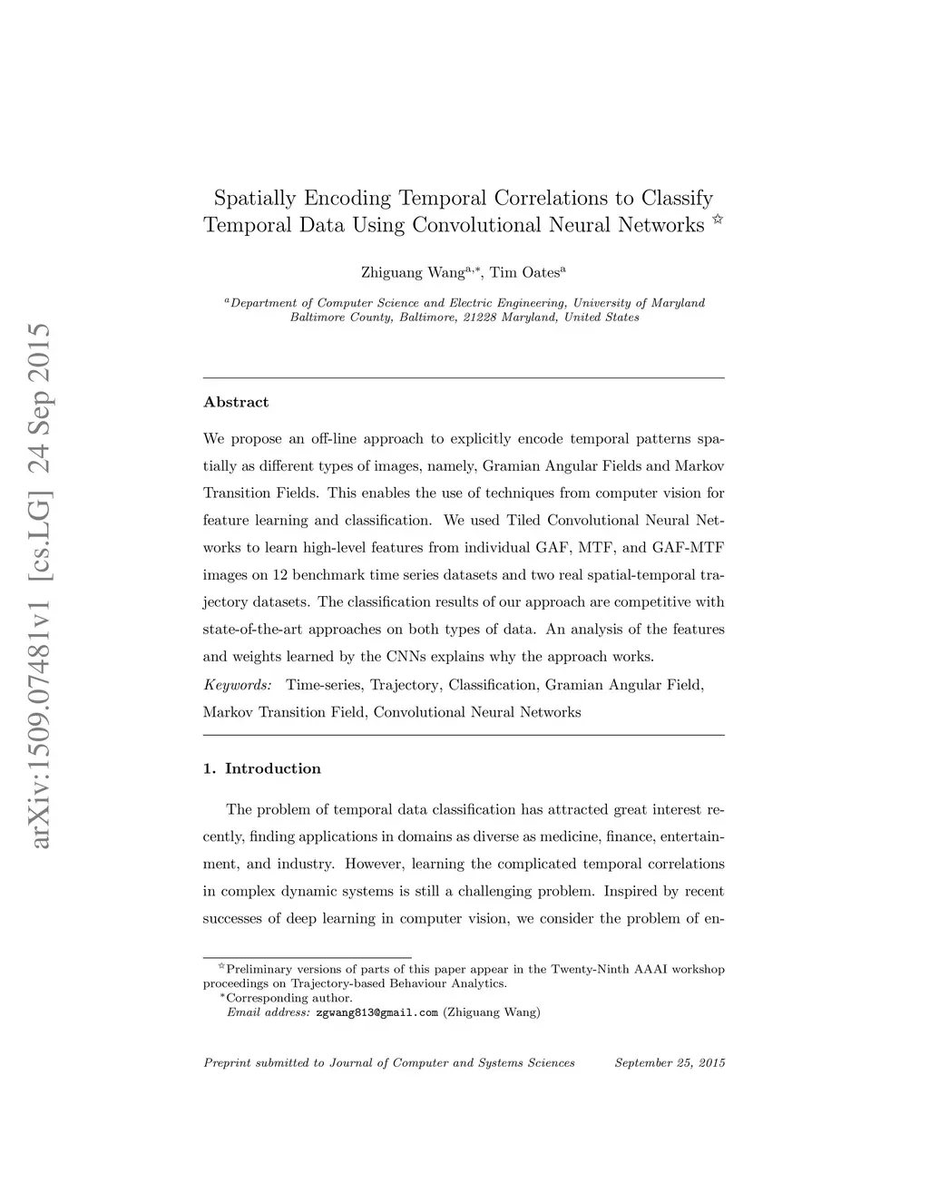 We propose an off-line approach to explicitly encode temporal patterns spatially as different types of images, namely, Gramian Angular Fields and Markov Transition Fields. This enables the use of techniques from computer vision for feature learning and classification. We used Tiled Convolutional Neural Networks to learn high-level features from individual GAF, MTF, and GAF-MTF images on 12 benchmark time series datasets and two real spatial-temporal trajectory datasets. The classification results of our approach are competitive with state-of-the-art approaches on both types of data. An analysis of the features and weights learned by the CNNs explains why the approach works.