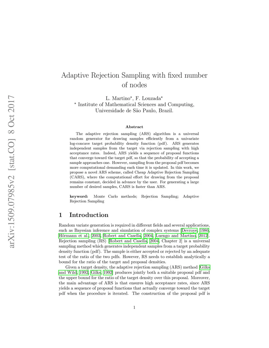 Adaptive Rejection Sampling with fixed number of nodes