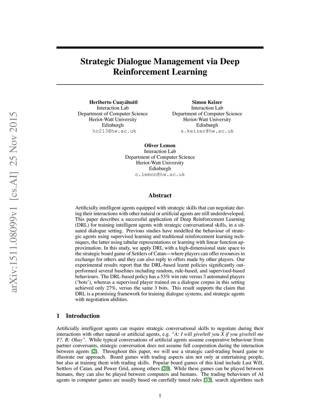 Strategic Dialogue Management via Deep Reinforcement Learning