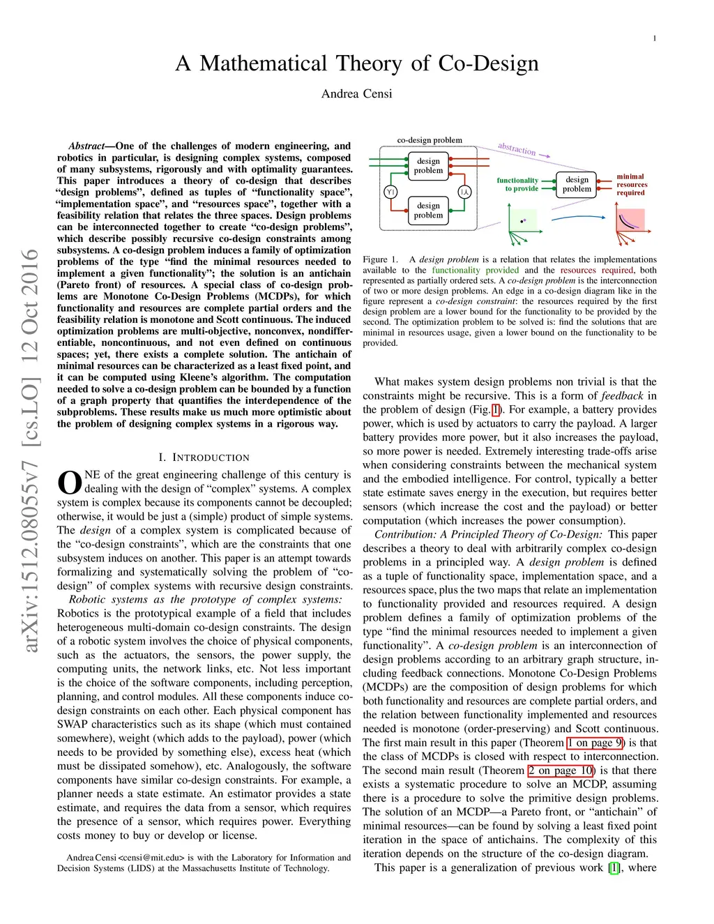 One of the challenges of modern engineering, and robotics in particular, is designing complex systems, composed of many subsystems, rigorously and with optimality guarantees. This paper introduces a theory of co-design that describes "design problems", defined as tuples of "functionality space", "implementation space", and "resources space", together with a feasibility relation that relates the three spaces. Design problems can be interconnected together to create "co-design problems", which describe possibly recursive co-design constraints among subsystems. A co-design problem induces a family of optimization problems of the type "find the minimal resources needed to implement a given functionality"; the solution is an antichain (Pareto front) of resources. A special class of co-design problems are Monotone Co-Design Problems (MCDPs), for which functionality and resources are complete partial orders and the feasibility relation is monotone and Scott continuous. The induced optimization problems are multi-objective, nonconvex, nondifferentiable, noncontinuous, and not even defined on continuous spaces; yet, there exists a complete solution. The antichain of minimal resources can be characterized as a least fixed point, and it can be computed using Kleene's algorithm. The computation needed to solve a co-design problem can be bounded by a function of a graph property that quantifies the interdependence of the subproblems. These results make us much more optimistic about the problem of designing complex systems in a rigorous way.