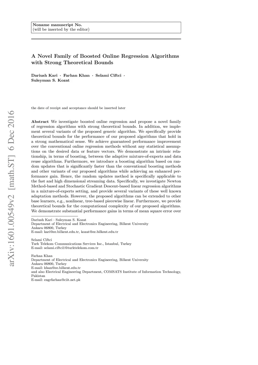 We investigate boosted online regression and propose a novel family of regression algorithms with strong theoretical bounds. In addition, we implement several variants of the proposed generic algorithm. We specifically provide theoretical bounds for the performance of our proposed algorithms that hold in a strong mathematical sense. We achieve guaranteed performance improvement over the conventional online regression methods without any statistical assumptions on the desired data or feature vectors. We demonstrate an intrinsic relationship, in terms of boosting, between the adaptive mixture-of-experts and data reuse algorithms. Furthermore, we introduce a boosting algorithm based on random updates that is significantly faster than the conventional boosting methods and other variants of our proposed algorithms while achieving an enhanced performance gain. Hence, the random updates method is specifically applicable to the fast and high dimensional streaming data. Specifically, we investigate Newton Method-based and Stochastic Gradient Descent-based linear regression algorithms in a mixture-of-experts setting and provide several variants of these well-known adaptation methods. However, the proposed algorithms can be extended to other base learners, e.g., nonlinear, tree-based piecewise linear. Furthermore, we provide theoretical bounds for the computational complexity of our proposed algorithms. We demonstrate substantial performance gains in terms of mean square error over the base learners through an extensive set of benchmark real data sets and simulated examples.