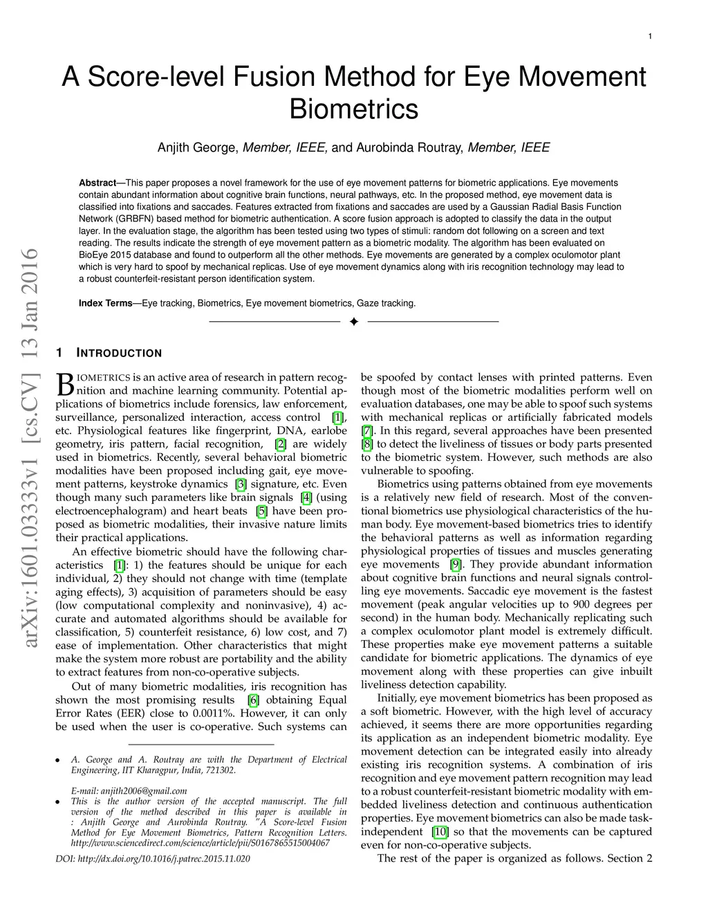 This paper proposes a novel framework for the use of eye movement patterns for biometric applications. Eye movements contain abundant information about cognitive brain functions, neural pathways, etc. In the proposed method, eye movement data is classified into fixations and saccades. Features extracted from fixations and saccades are used by a Gaussian Radial Basis Function Network (GRBFN) based method for biometric authentication. A score fusion approach is adopted to classify the data in the output layer. In the evaluation stage, the algorithm has been tested using two types of stimuli: random dot following on a screen and text reading. The results indicate the strength of eye movement pattern as a biometric modality. The algorithm has been evaluated on BioEye 2015 database and found to outperform all the other methods. Eye movements are generated by a complex oculomotor plant which is very hard to spoof by mechanical replicas. Use of eye movement dynamics along with iris recognition technology may lead to a robust counterfeit-resistant person identification system.