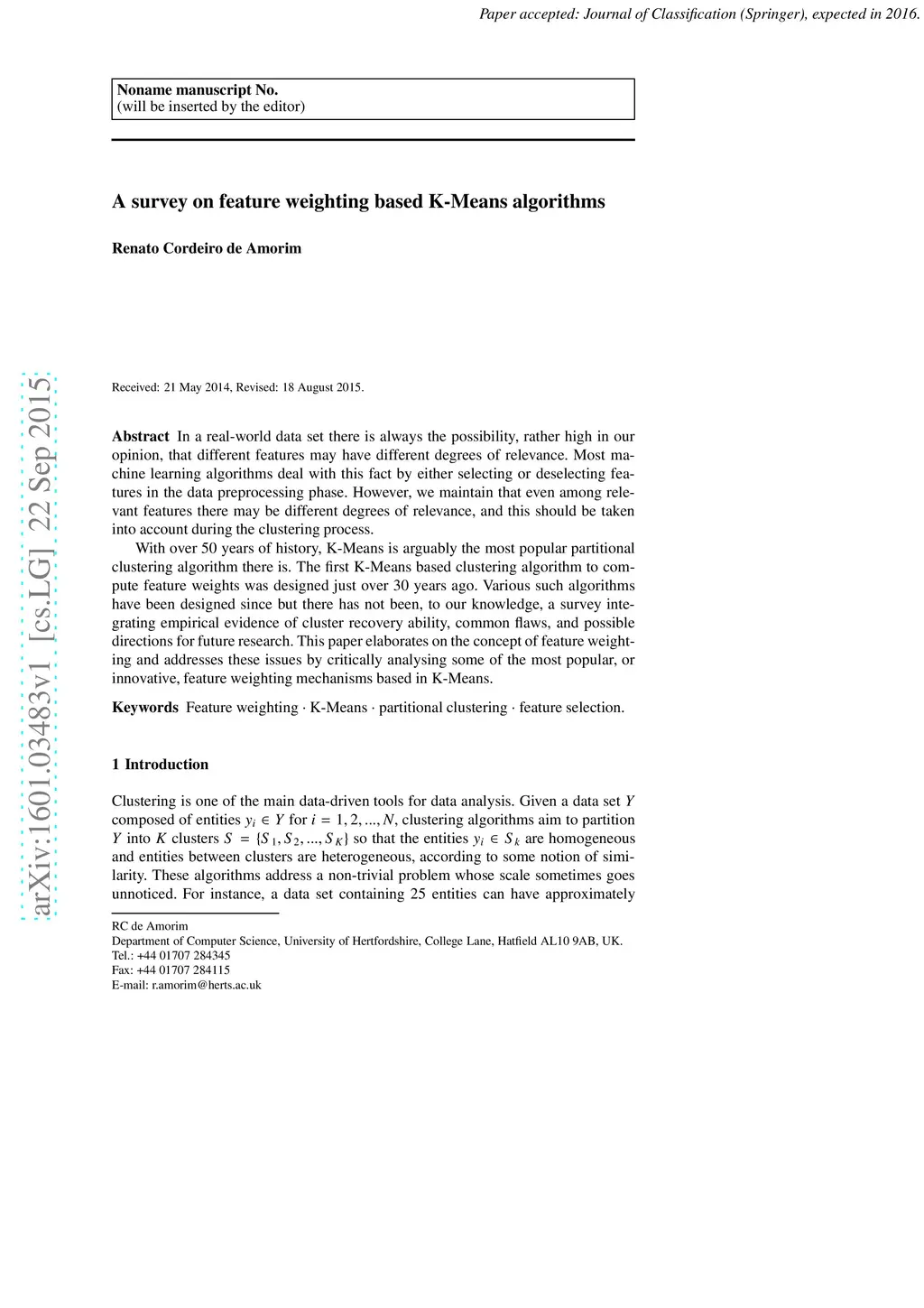 A survey on feature weighting based K-Means algorithms