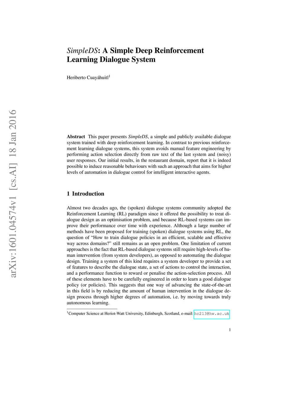 SimpleDS: A Simple Deep Reinforcement Learning Dialogue System