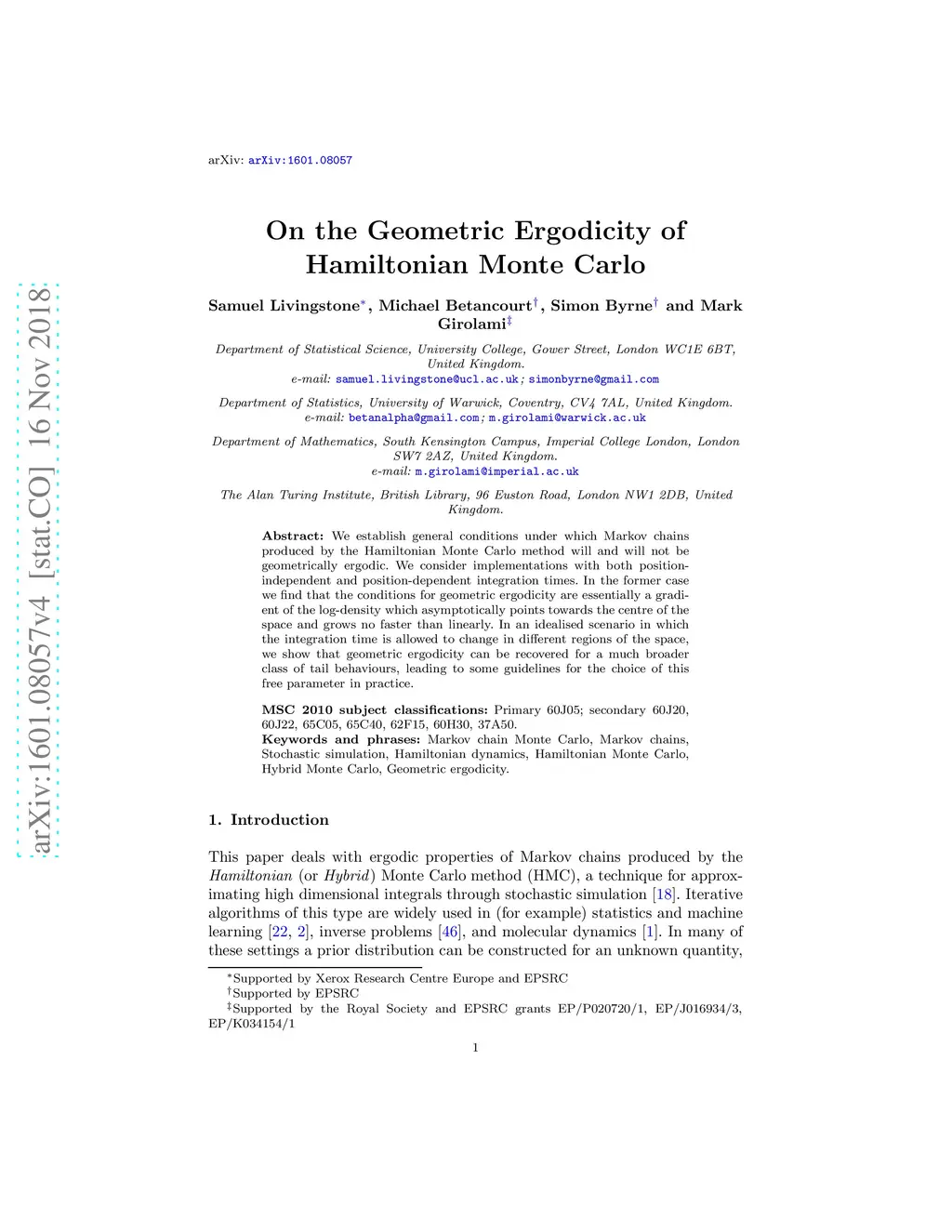 On the Geometric Ergodicity of Hamiltonian Monte Carlo