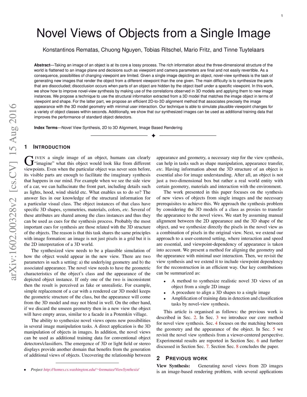 Taking an image of an object is at its core a lossy process. The rich information about the three-dimensional structure of the world is flattened to an image plane and decisions such as viewpoint and camera parameters are final and not easily revertible. As a consequence, possibilities of changing viewpoint are limited. Given a single image depicting an object, novel-view synthesis is the task of generating new images that render the object from a different viewpoint than the one given. The main difficulty is to synthesize the parts that are disoccluded; disocclusion occurs when parts of an object are hidden by the object itself under a specific viewpoint. In this work, we show how to improve novel-view synthesis by making use of the correlations observed in 3D models and applying them to new image instances. We propose a technique to use the structural information extracted from a 3D model that matches the image object in terms of viewpoint and shape. For the latter part, we propose an efficient 2D-to-3D alignment method that associates precisely the image appearance with the 3D model geometry with minimal user interaction. Our technique is able to simulate plausible viewpoint changes for a variety of object classes within seconds. Additionally, we show that our synthesized images can be used as additional training data that improves the performance of standard object detectors.