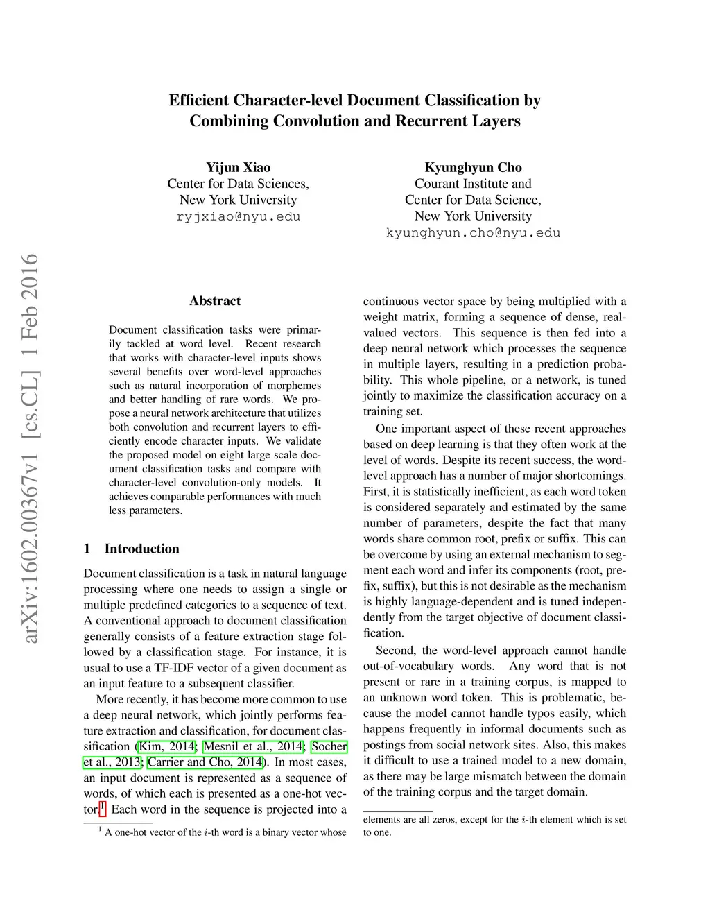 Document classification tasks were primarily tackled at word level. Recent research that works with character-level inputs shows several benefits over word-level approaches such as natural incorporation of morphemes and better handling of rare words. We propose a neural network architecture that utilizes both convolution and recurrent layers to efficiently encode character inputs. We validate the proposed model on eight large scale document classification tasks and compare with character-level convolution-only models. It achieves comparable performances with much less parameters.